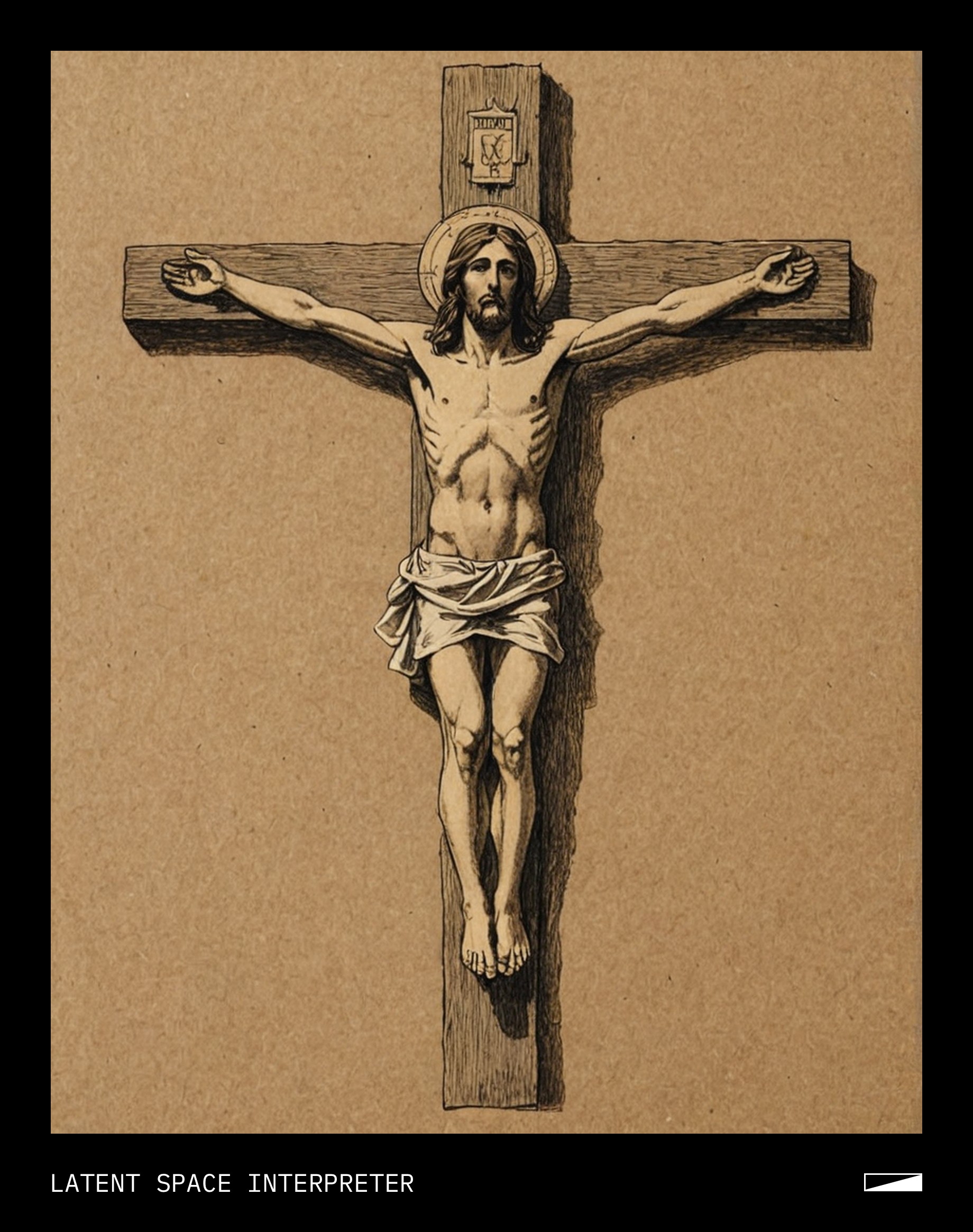 The image features a drawing of a cross with a person inside it, likely Jesus. The drawing is done on a piece of paper or cardboard, which has been placed on top of a table. The figure of the person within the cross appears to be a child, and the overall scene gives off a sense of innocence and purity.