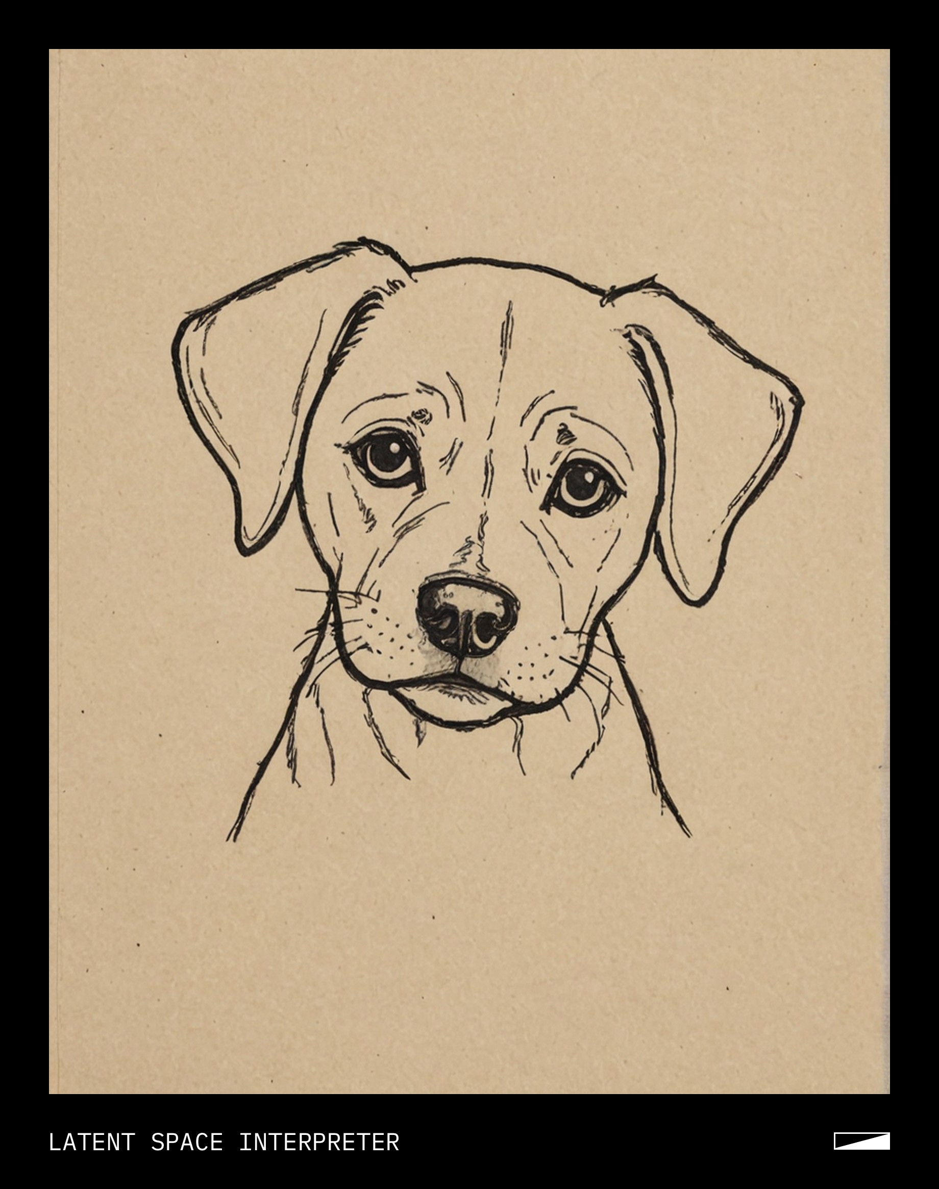 The image features a drawing of a dog, likely created by a child or artist, with the head being the main focus. The dog's face is depicted as having a sad expression, and it appears to be looking at something off-camera. The drawing is placed on a piece of paper that covers most of the scene.