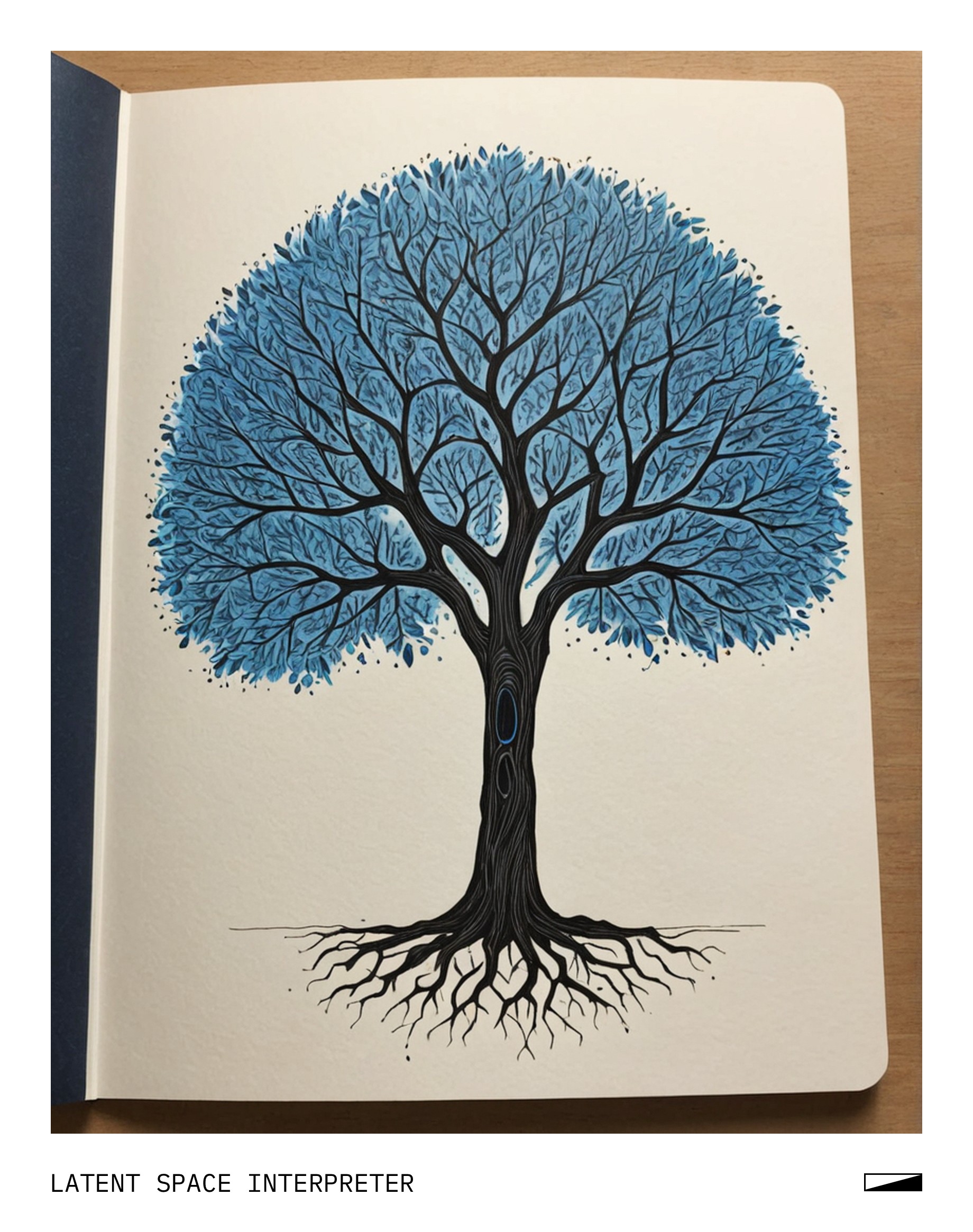 The image features a creatively drawn tree on a white piece of paper, which is placed within a book or a notebook. The tree has a unique shape and appears to be made with a combination of blue and black colors. It seems to have been created using a pencil for the drawing. The tree's branches extend across the entire width of the page, giving it a sense of depth and dimension.