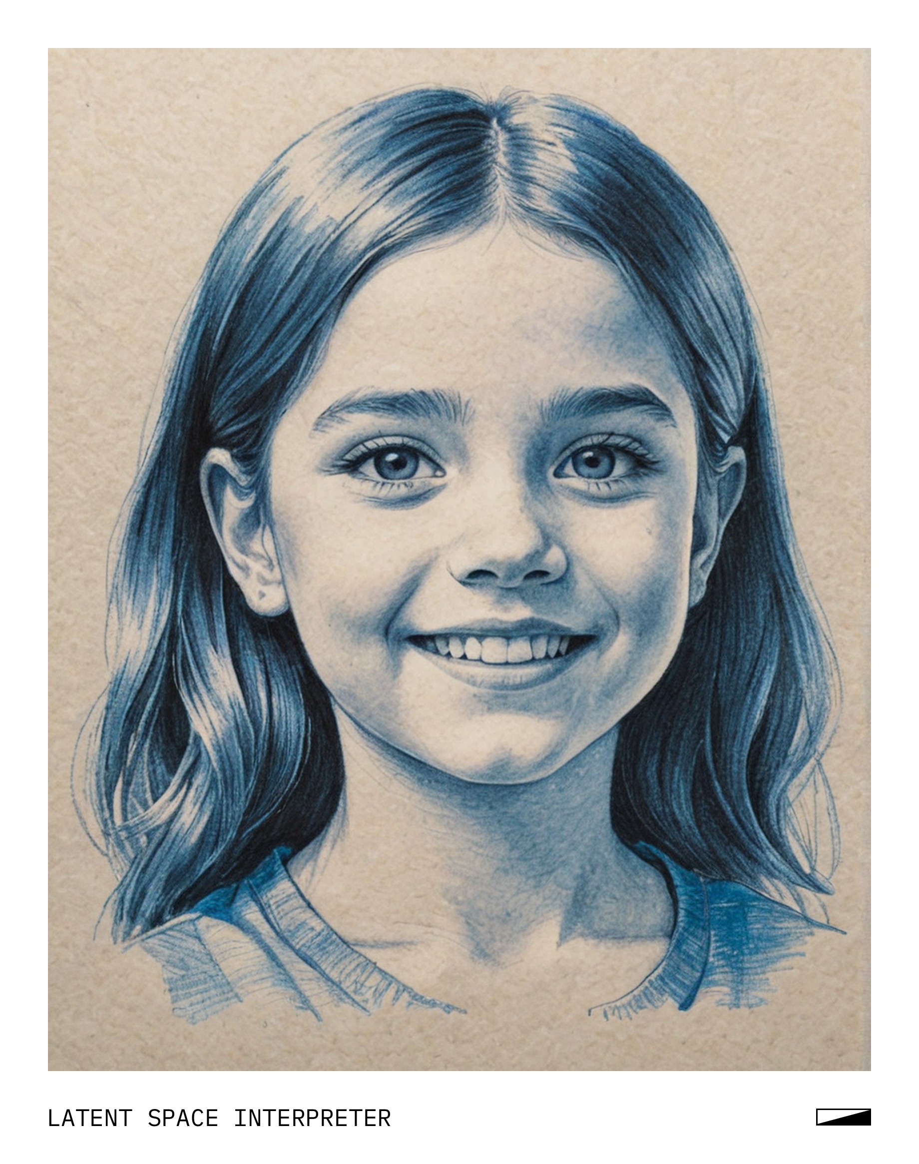 The image features a hand-drawn picture of a young girl's face on a piece of paper, with a blue colored pencil. The drawing is placed near the center of the paper and is quite detailed. The little girl appears to be smiling as she looks upwards. The background seems to be blurry or out of focus, giving emphasis to the main subject of the drawing.