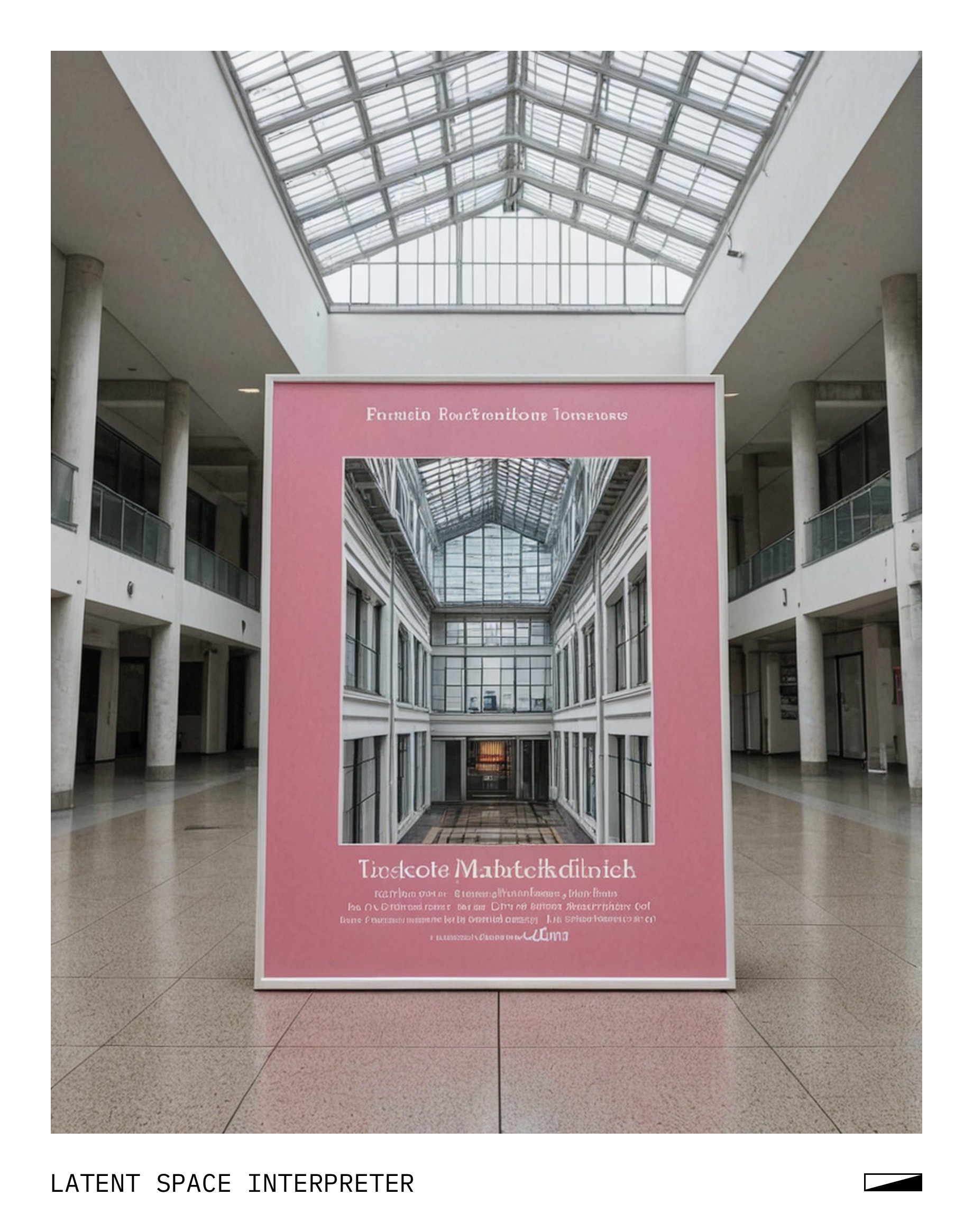 The image showcases a pink and white poster with German writing displayed on it. Apart from the main poster, there is also a reflection of the poster visible in the background. The setting appears to be indoors, possibly inside a building or atrium, as seen by the presence of roof structures and skylights above the area.