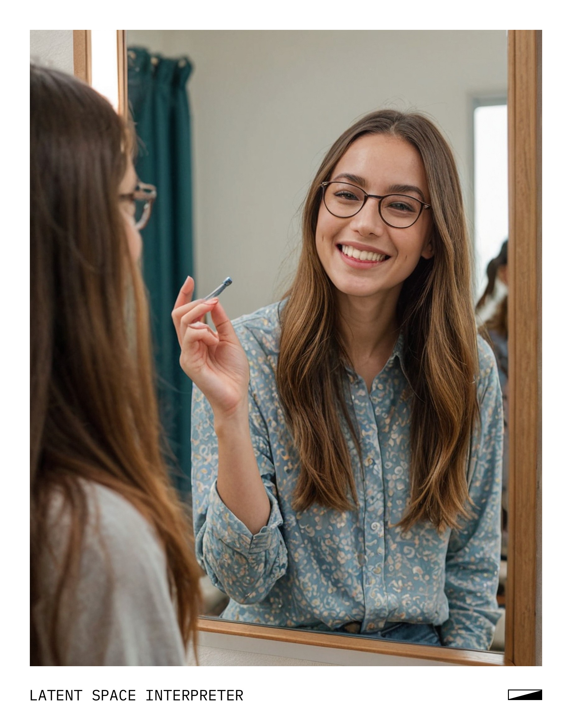 The image features a young woman with long hair and glasses, posing for the camera while looking at her reflection in a mirror. She is smiling as she gazes into the mirror, capturing her happy expression. Her reflection can be seen clearly in the mirror, showing her entire face and upper body.