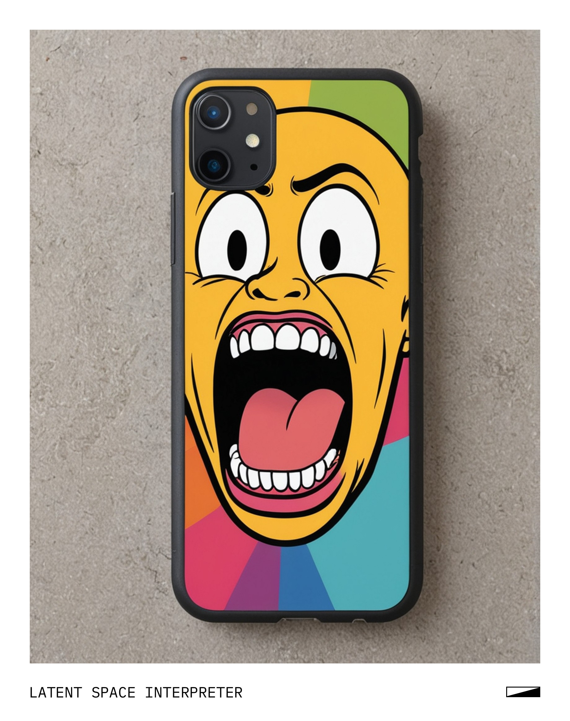 The image features a cartoon drawing of a character with a mouth wide open, as if yelling or expressing distress. It's placed on the back of a cell phone. The picture is colorful and adds some fun to the otherwise simple cell phone design.