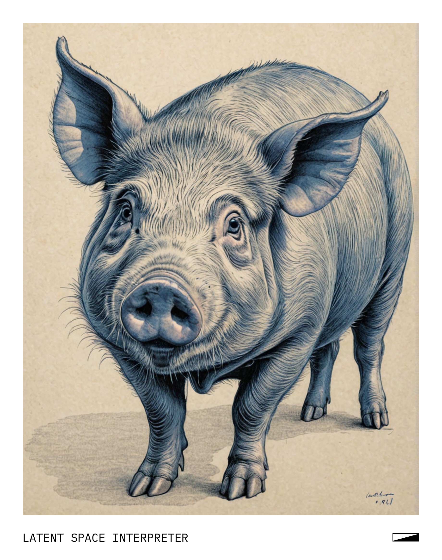 The image features a large, pencil-drawn picture of a big pig or hog on a piece of paper. The drawing is quite detailed and captures the animal's unique features. The image appears to be drawn with a blue pen, giving it a slightly different shade compared to the standard black drawing. It is a creative and imaginative representation of the pig.