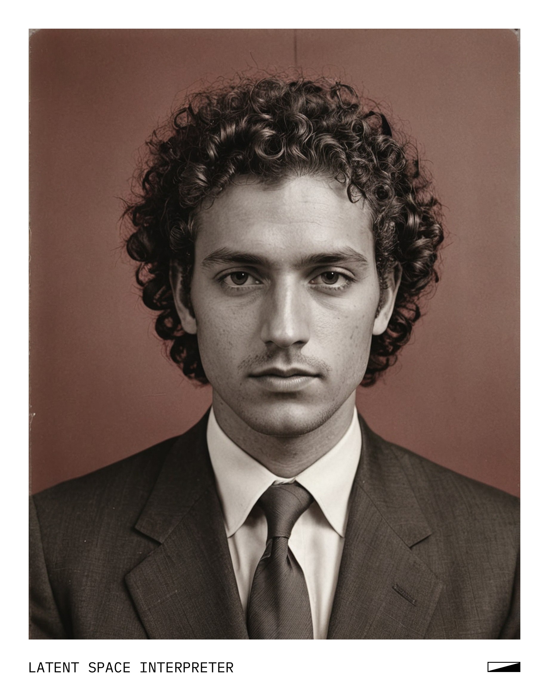 The image showcases a black and white photograph of a man with curly hair, wearing a suit and tie. He appears to be looking at the camera, capturing his attentive gaze. The photo is mounted on a reddish wooden frame which adds a touch of warmth to the overall presentation.