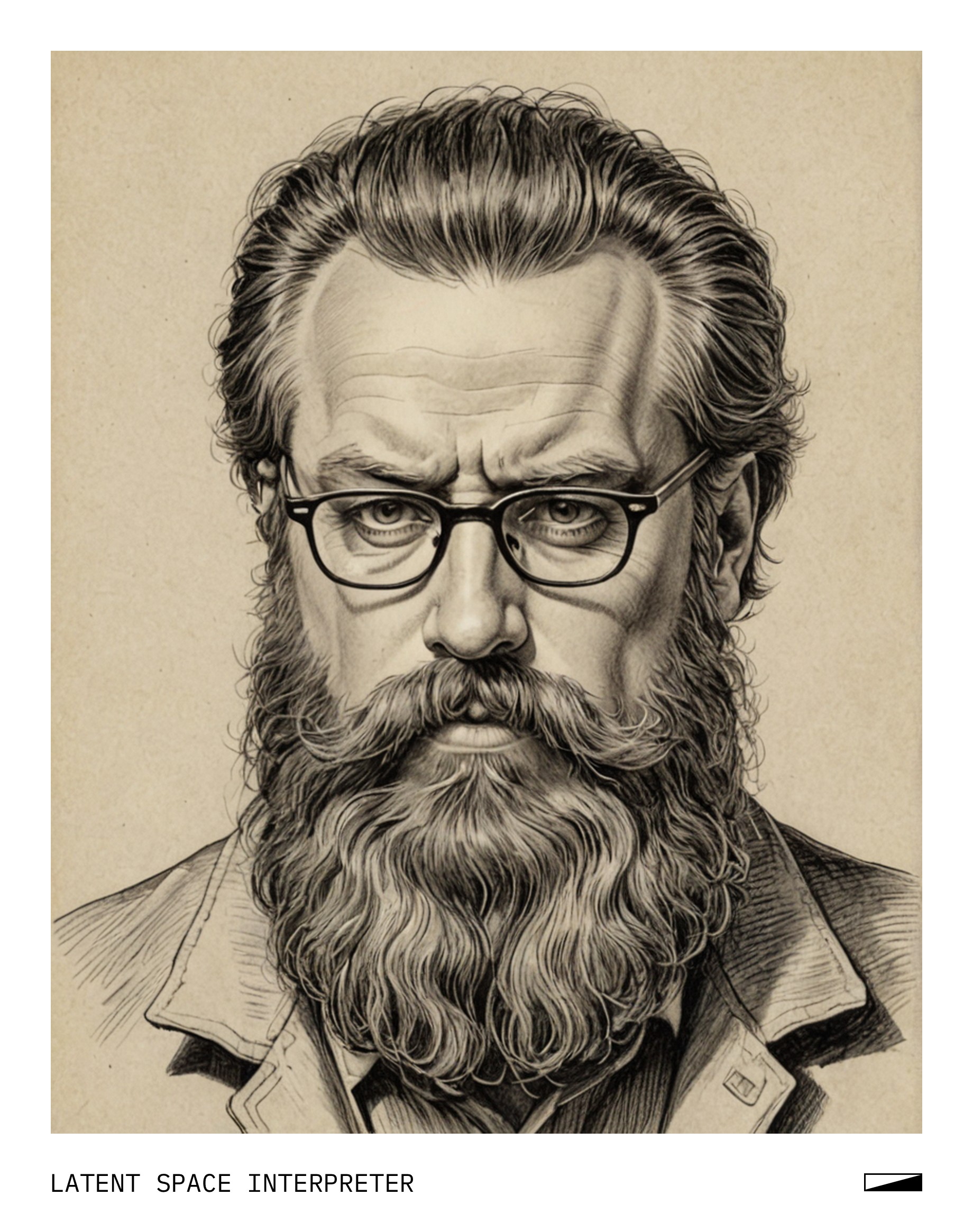 The drawing depicts a man with a large beard, wearing glasses. He appears to have a somewhat angry expression on his face, possibly indicating that he might not be pleased or content at the moment. This illustration captures the details of the man's appearance and personality through its artistic representation.