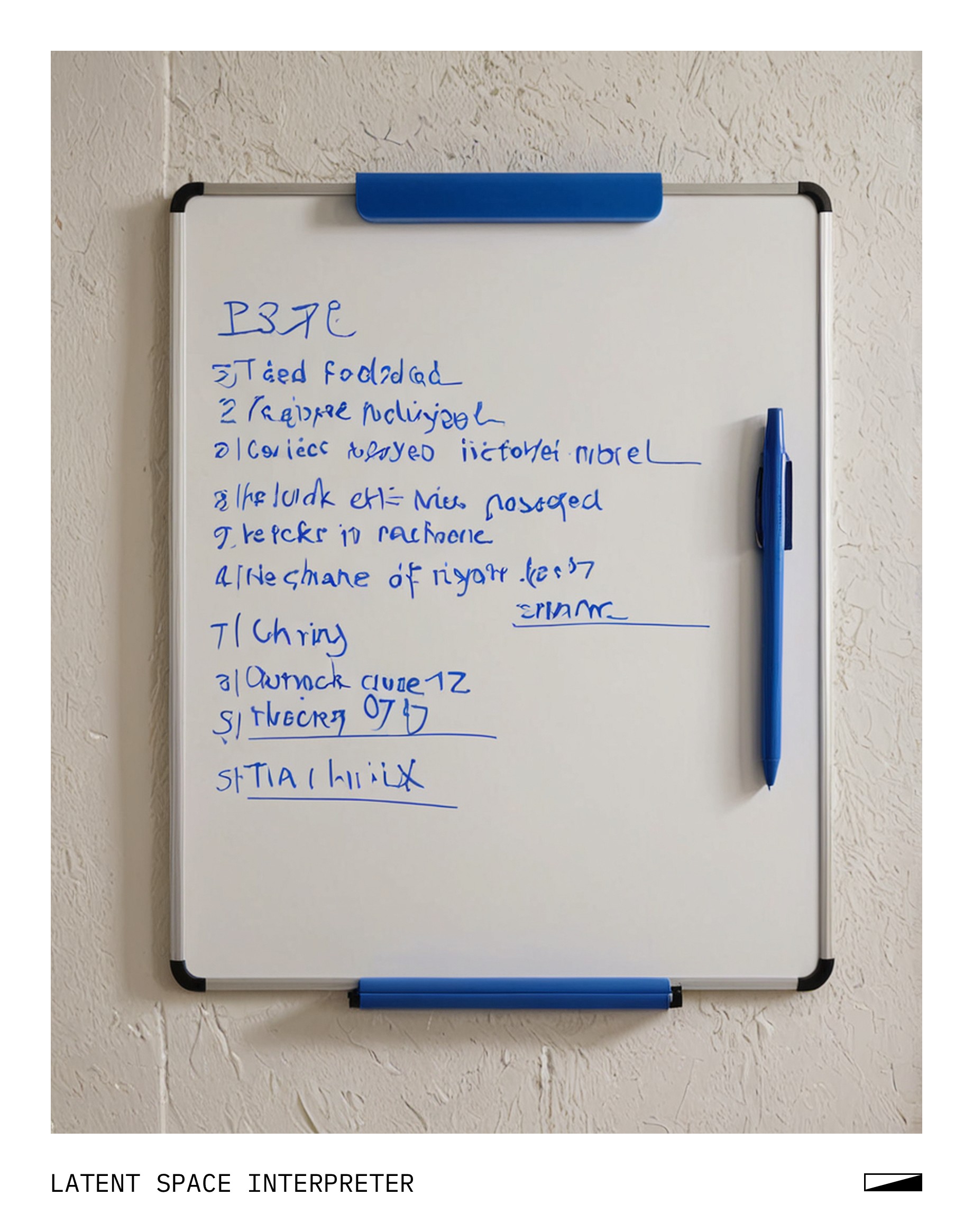 The image features a whiteboard with a blue pen, which has been used to write a signature or drawing on it. The writing appears to be a combination of letters and numbers, possibly resembling the shape of a bird. The board is placed against a wall, giving it a clean and organized appearance.