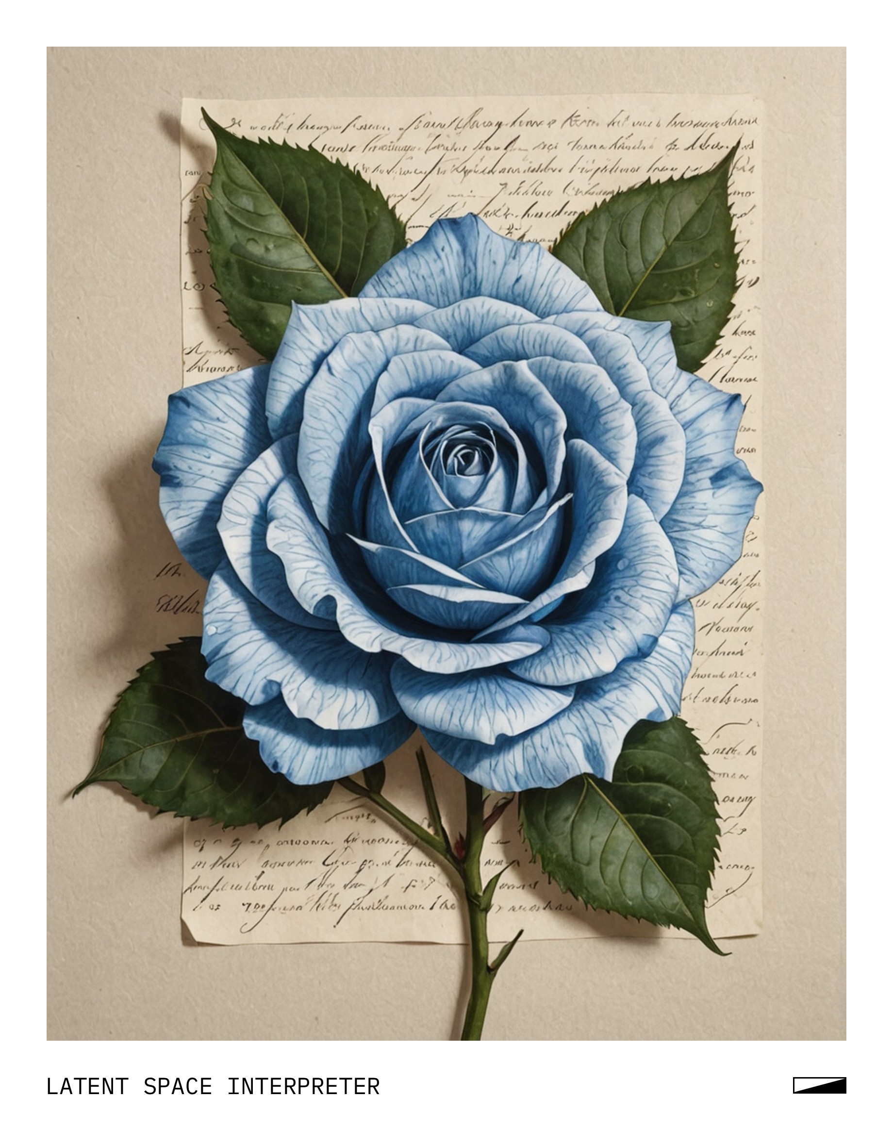 The image features a white piece of paper with a blue rose drawn on it, along with some writing. The drawing is quite detailed and captures the essence of the flower. The paper appears to be placed on top of another surface or possibly attached to a wall.