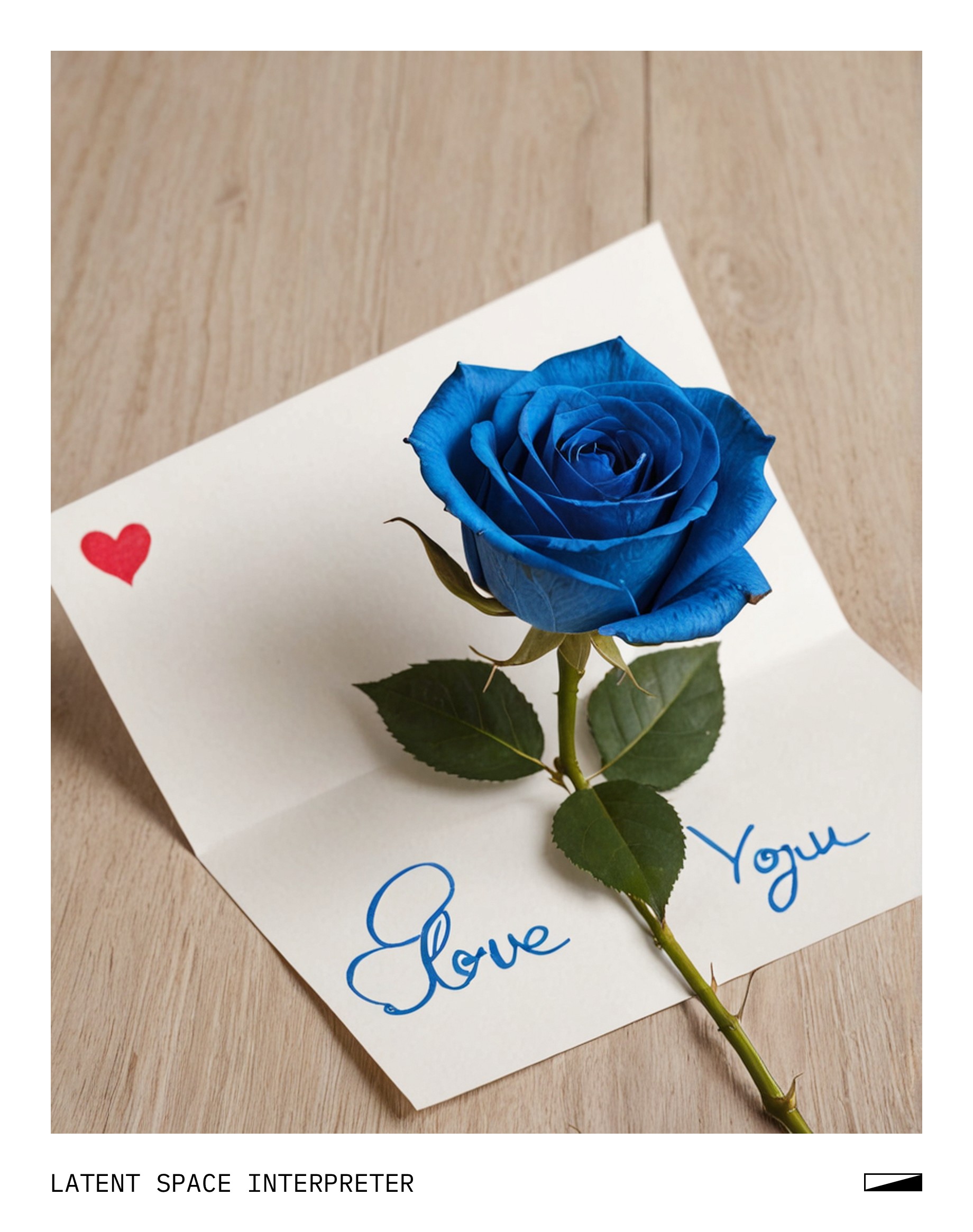 The image features a white piece of paper with a blue rose drawn on it, accompanied by the words "I love you." Above the rose, there is a heart-shaped drawing that adds to the sentimental nature of the message. The paper appears to be placed on top of a table or other surface, possibly for display or as a decoration.