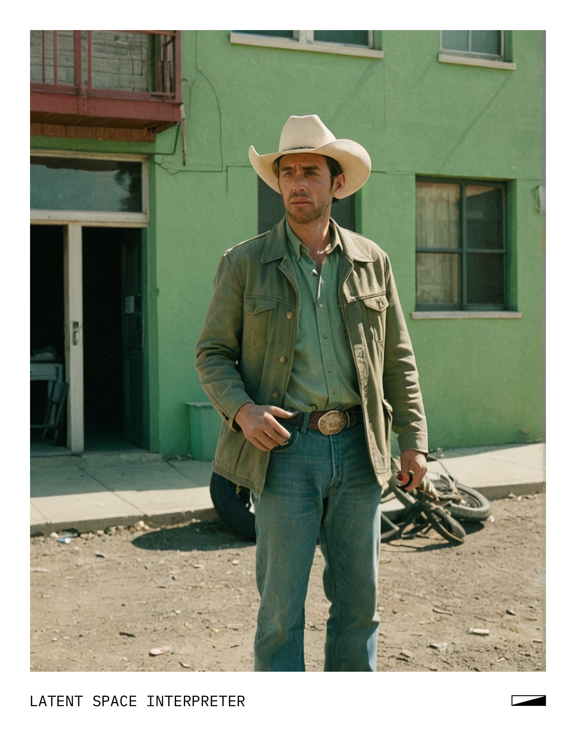 The image features a man wearing a cowboy hat, standing outside of a building with a green tint to it. He appears to be smoking a cigarette while looking at the camera. There is another person visible in the background, but they are not as prominent as the main subject.