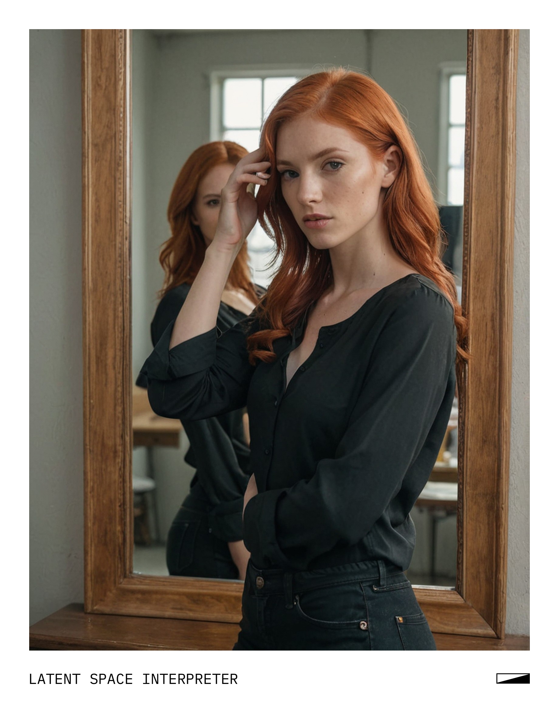 The image features a woman with red hair, wearing a black shirt and standing in front of a mirror. She is posing for the camera, capturing her reflection in the mirror. The scene appears to be set in a room with a window nearby.