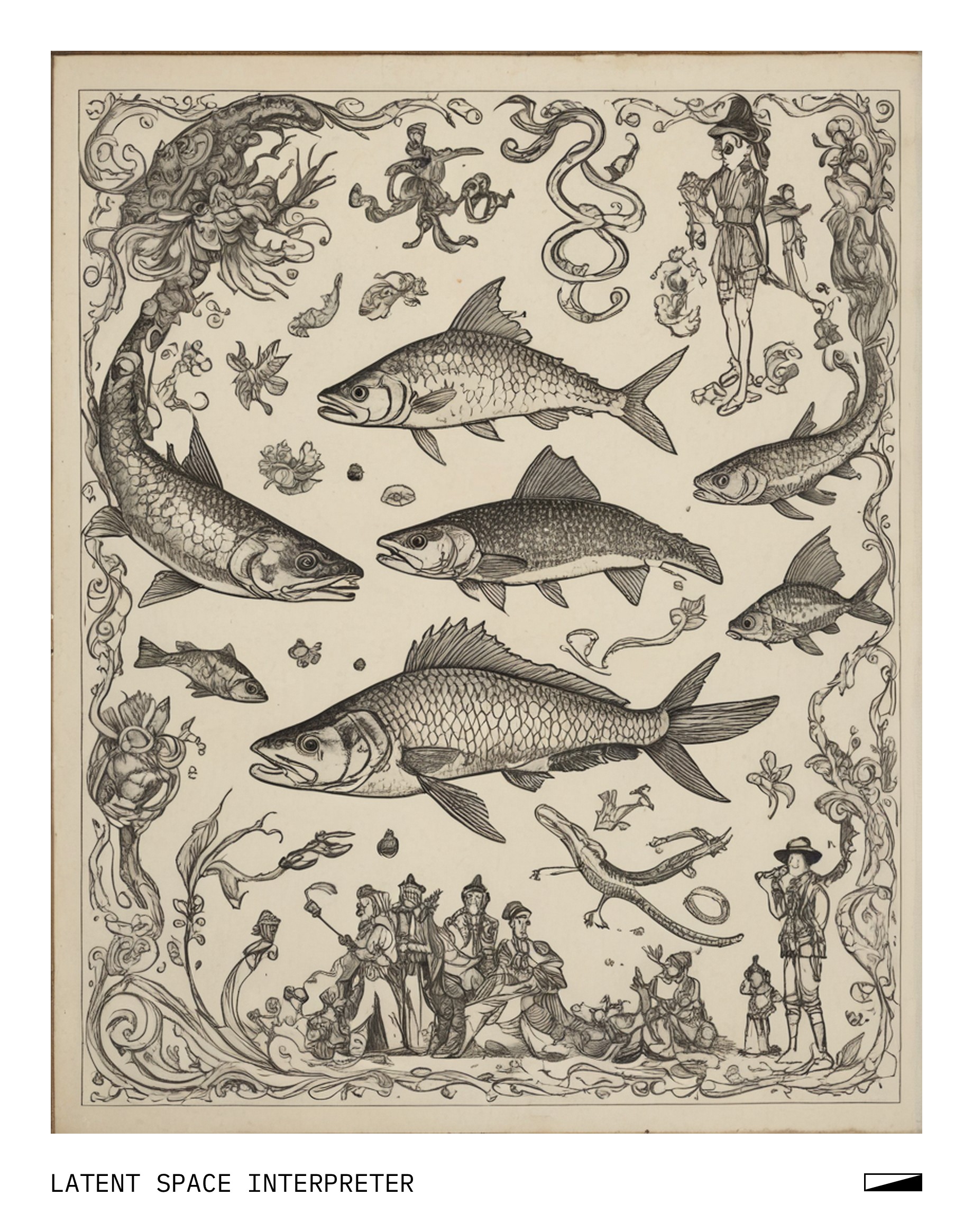 The image features a white sheet of paper with various drawings and symbols on it, including a picture of a fish, a man, a woman, and a snake. There is also a drawing of a person wearing a hat, which appears to be the main focus of the scene. In addition to these figures, there are several other smaller drawings scattered throughout the page. A person can be seen at the bottom left corner of the image, possibly observing or interacting with the artwork.