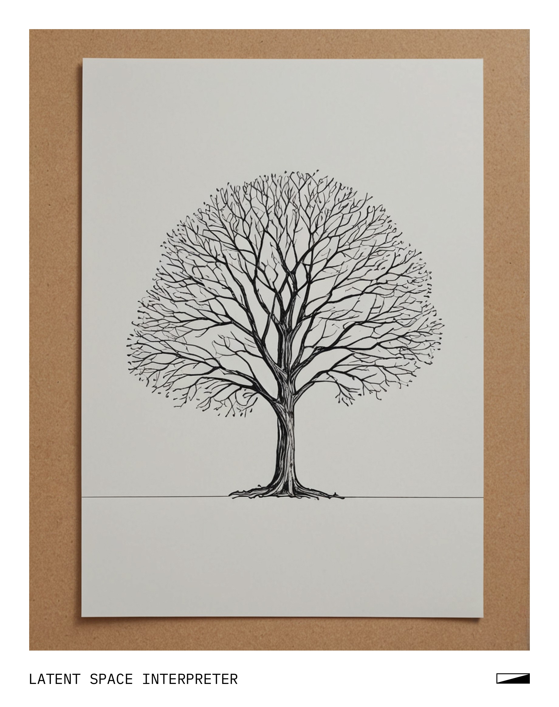 The image features a tree drawing on a piece of paper, which is placed on top of a table or countertop. The tree appears to be a simple outline with no leaves, giving it a minimalist appearance. The drawing is positioned towards the left side of the scene and covers most of the surface area where it's placed.