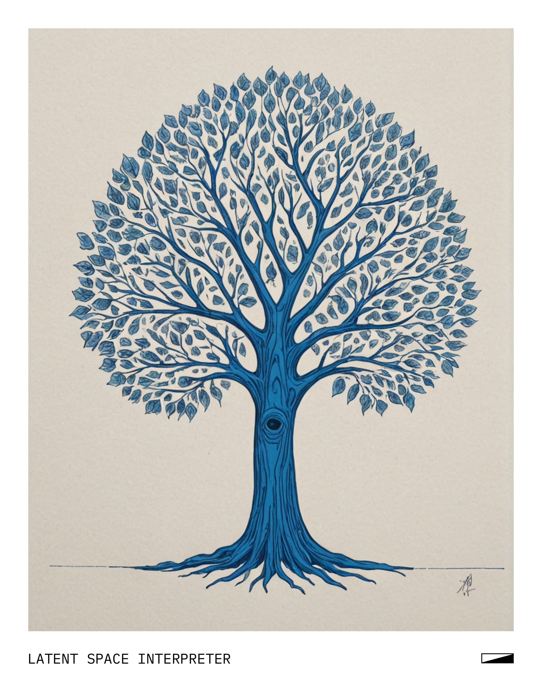 The image features a white piece of paper with a blue drawing of a tree on it. The tree is depicted as having a large head, giving the impression that it's a caricature or cartoon-like representation. The drawing appears to be quite detailed and well-executed, capturing the essence of the tree's unique characteristics.