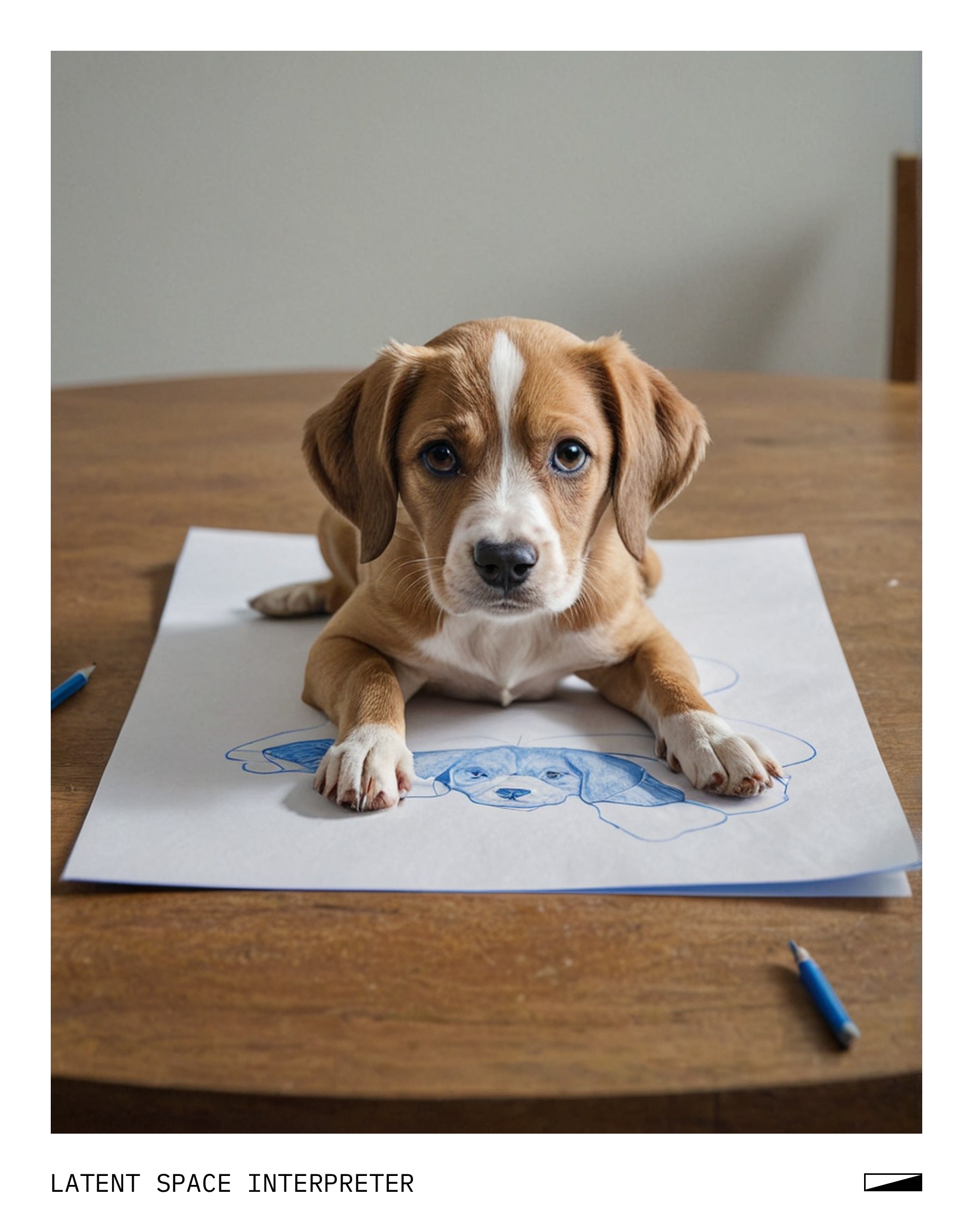 The image features a drawing of a dog on a piece of paper, which is placed on top of a table. The dog appears to be sad and has a blue nose. The drawing is quite detailed, capturing the essence of the dog's facial expression and body shape. The overall scene gives off a sense of creativity and artistic expression.