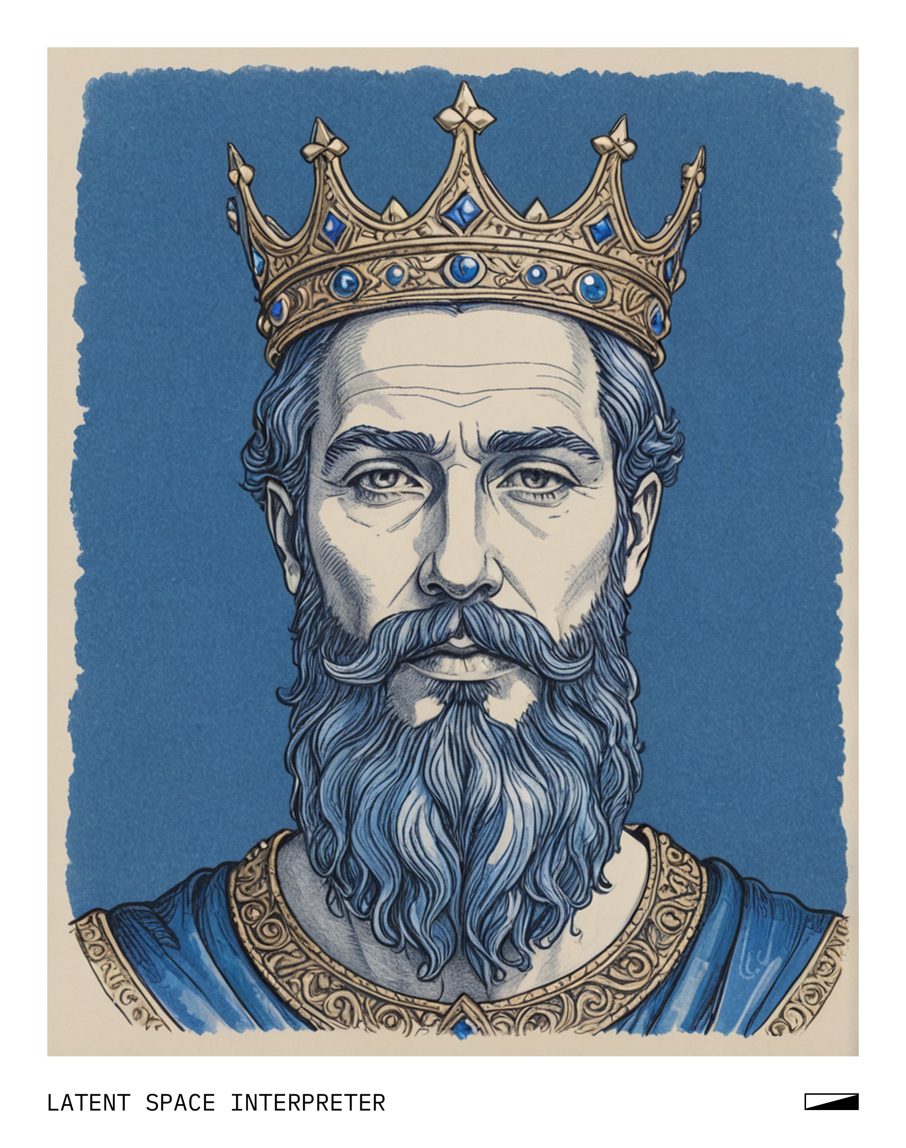 The image features a drawing of a man with a beard and a crown on his head, giving him the appearance of a king. This artistic representation is done using a blue pen to create the outline of the man's face and the crown. The drawing appears to be a sketch or a cartoon-like illustration, capturing the essence of a regal figure.