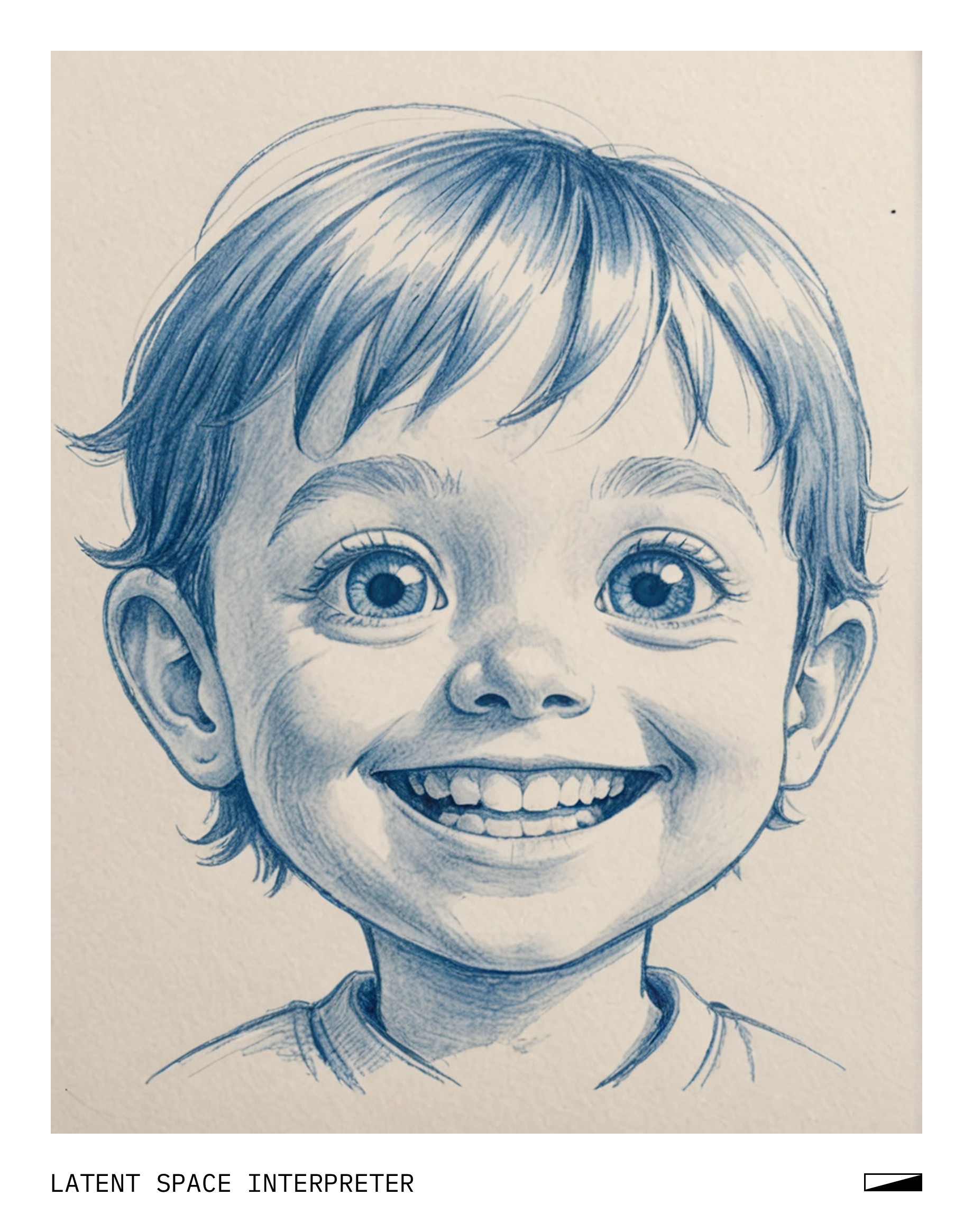 The image features a drawing of a cartoon face, likely a child's, with a big smile and two eyes. The drawing is done in blue pencil on a white background. The facial expression appears to be happy and friendly, capturing the essence of a young person's joyful demeanor.