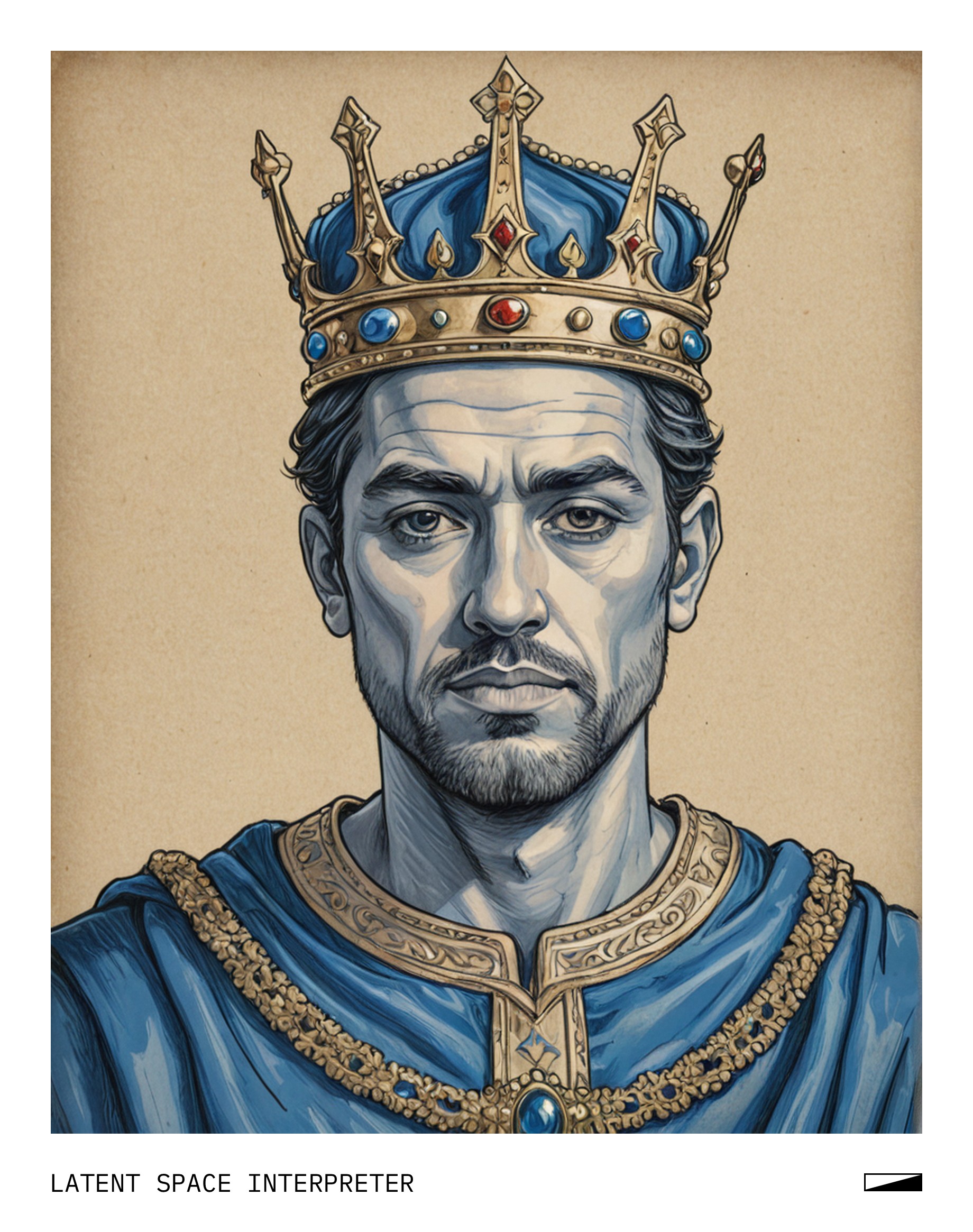 The image features a blue drawing of a man with a crown on his head, giving him the appearance of a king or a royal figure. This cartoon-like depiction is quite detailed and captures the essence of the subject's facial expression. The drawing appears to be hand-drawn, adding a personal touch to the artwork.