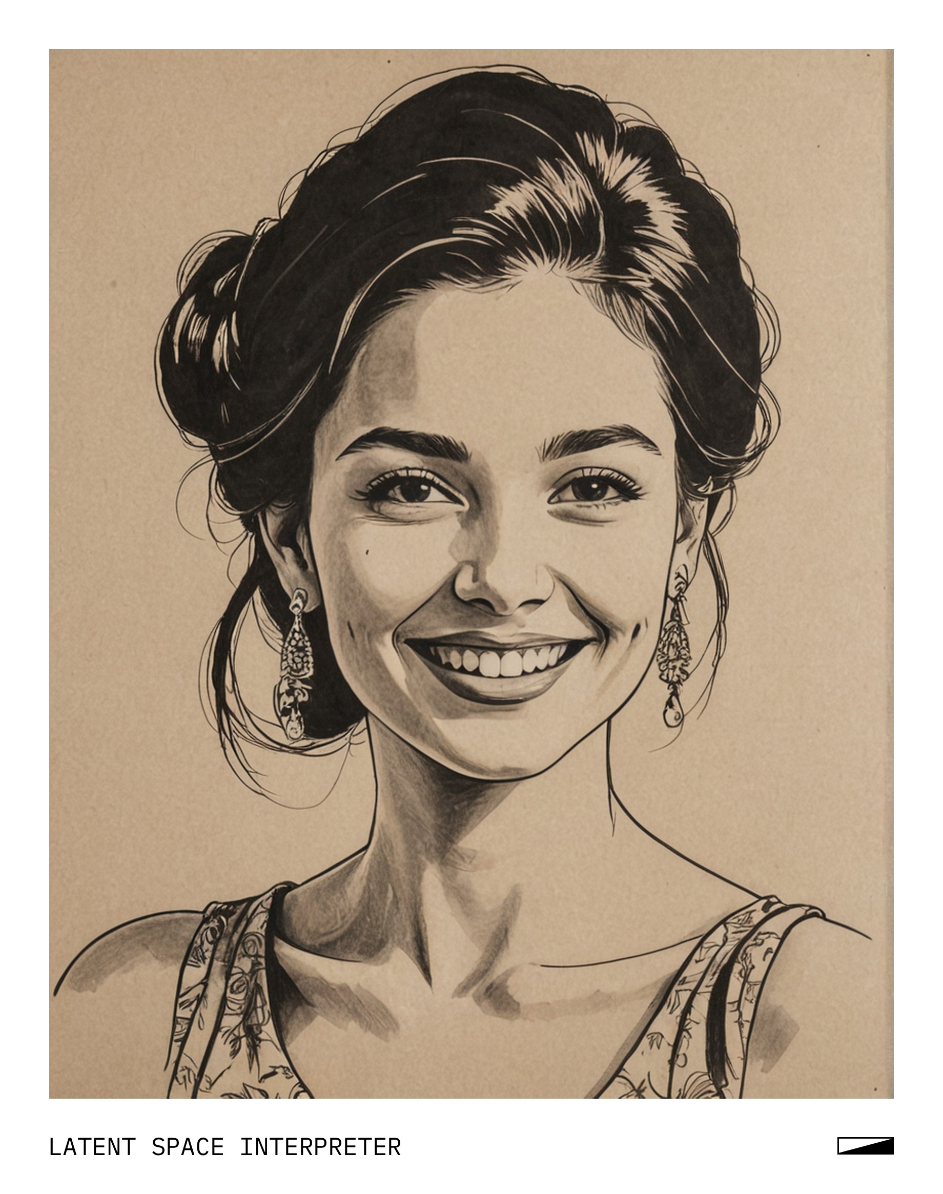 The image features a drawing of a woman with a smiling face, wearing a dress and earrings. She has a large head of hair, giving her a unique appearance. The drawing is done on paper, which is placed on a surface or possibly attached to the wall. The artwork captures the essence of the woman's character and adds a touch of creativity to the space where it is displayed.