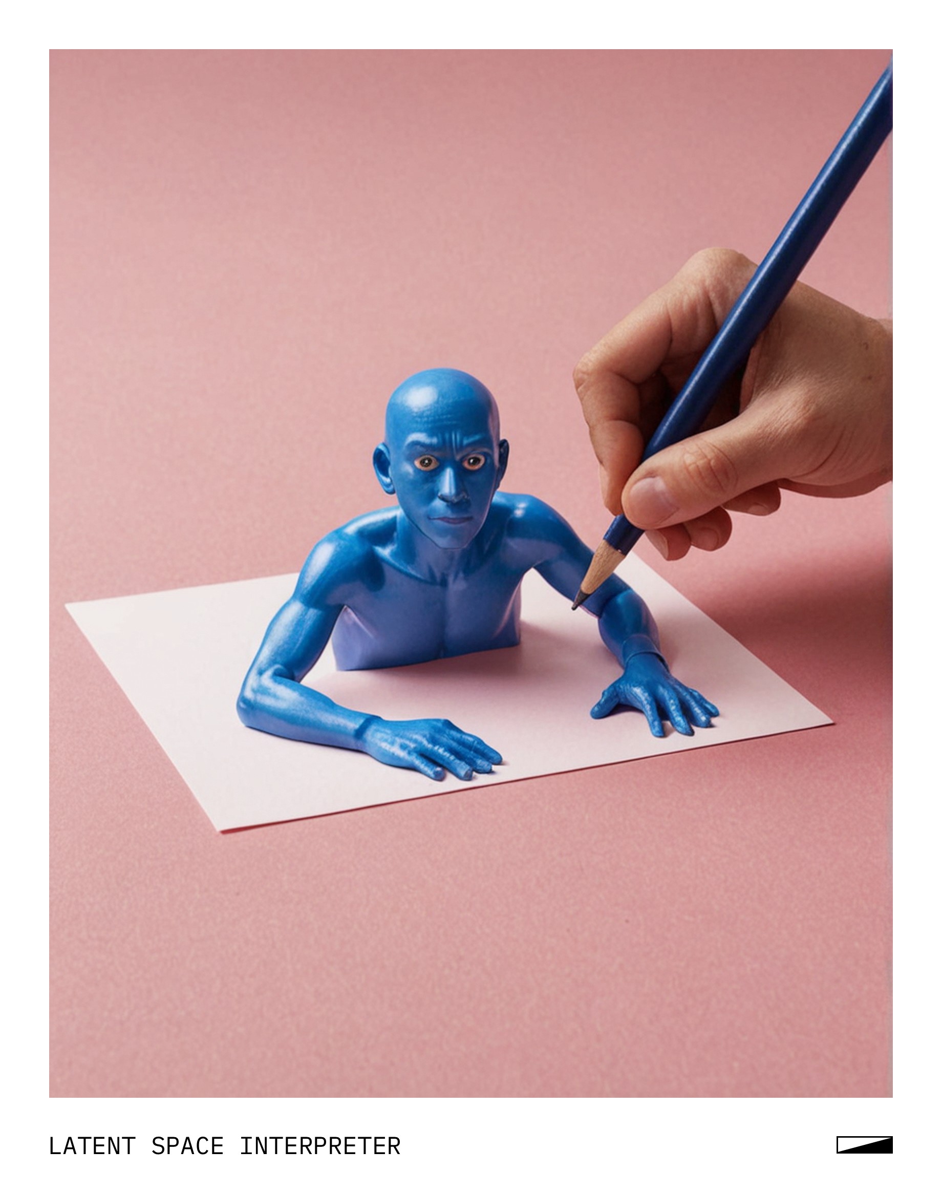 The image features a blue man drawing on a piece of paper, which is placed on top of a pink surface. The drawing appears to be a cartoon or caricature of the person, with the figure standing and posing for the picture. The paper itself has a slightly blurry appearance, possibly due to the artist's hand movements during the creation process.