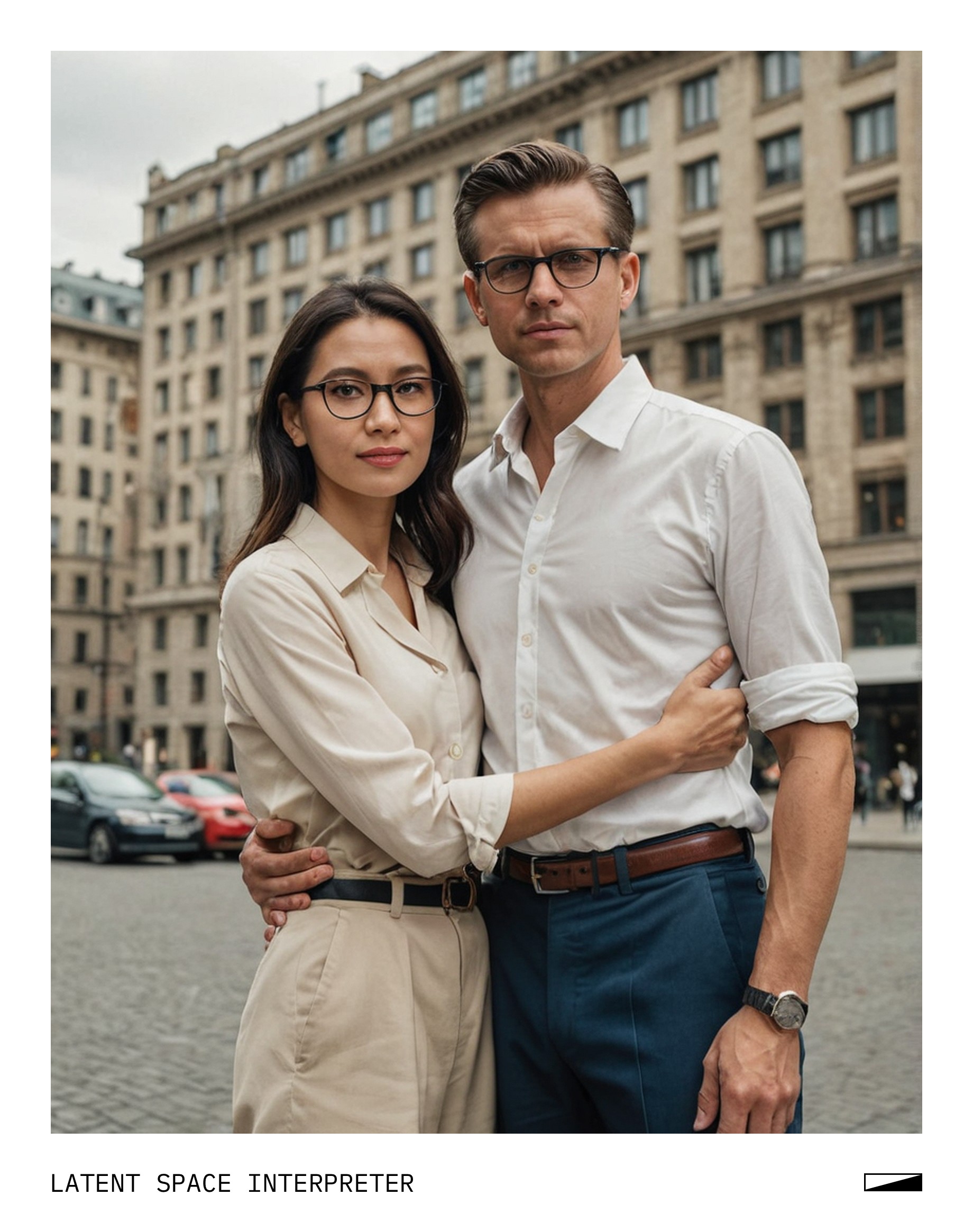 The image features a man and a woman standing together, both wearing glasses. They appear to be posing for the camera, with the man on the left side of the frame and the woman on the right. Both individuals have their arms around each other, creating a sense of closeness between them.