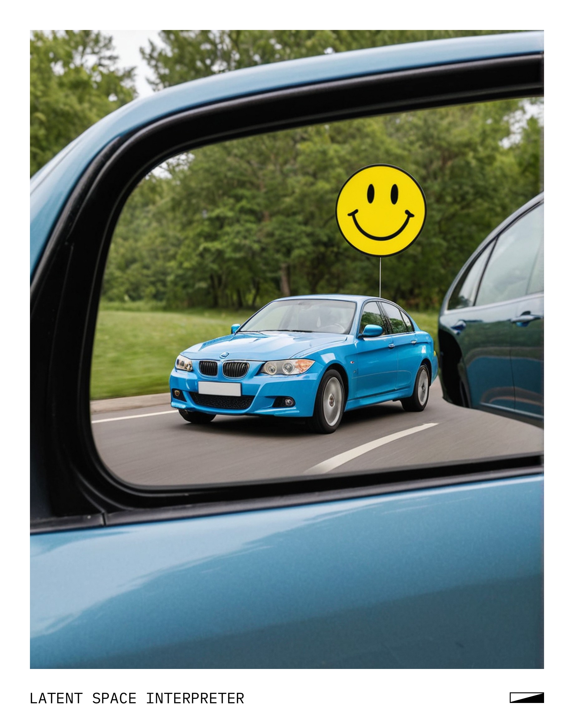 The image features a blue car drawn on a piece of paper, which is placed on top of a mirror or a glass surface. The car appears to be a cartoon-like representation with a smiley face and a curved line for the front wheel. The drawing seems to be a creative and playful addition to the mirror's surface.