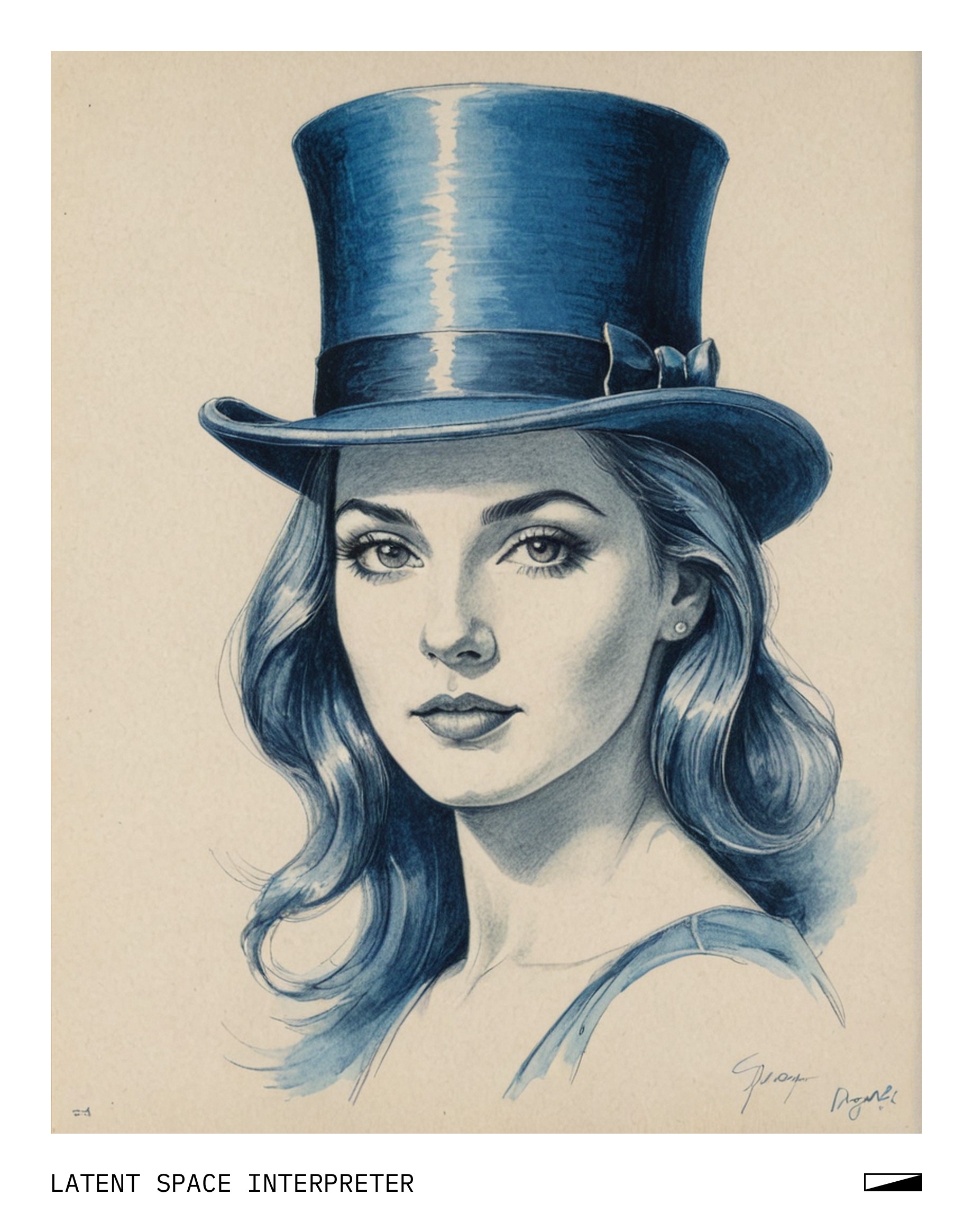 The image features a drawing of a woman's face with a hat on her head, giving the impression that she is wearing a top hat. The drawing appears to be done by hand and has a blue color tone. The woman's face is prominently displayed in the center of the picture, while the hat covers most of her head.