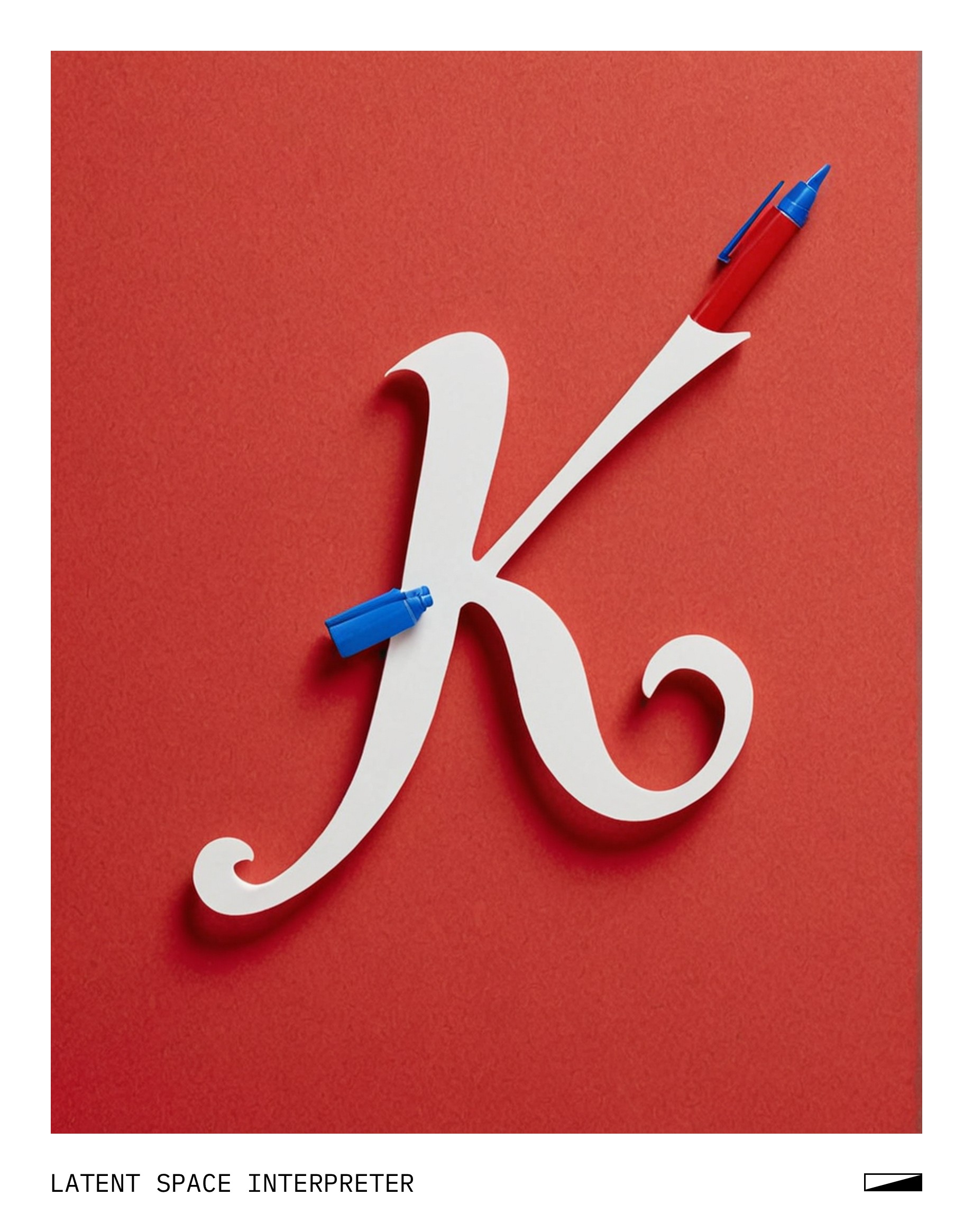 The image features a white piece of paper with a blue pen drawing on it, depicting the letter "K" in cursive style. The drawing is placed on top of a red background, creating a visually appealing contrast between the two colors. The overall composition showcases a creative and artistic approach to writing or drawing the letter "K".