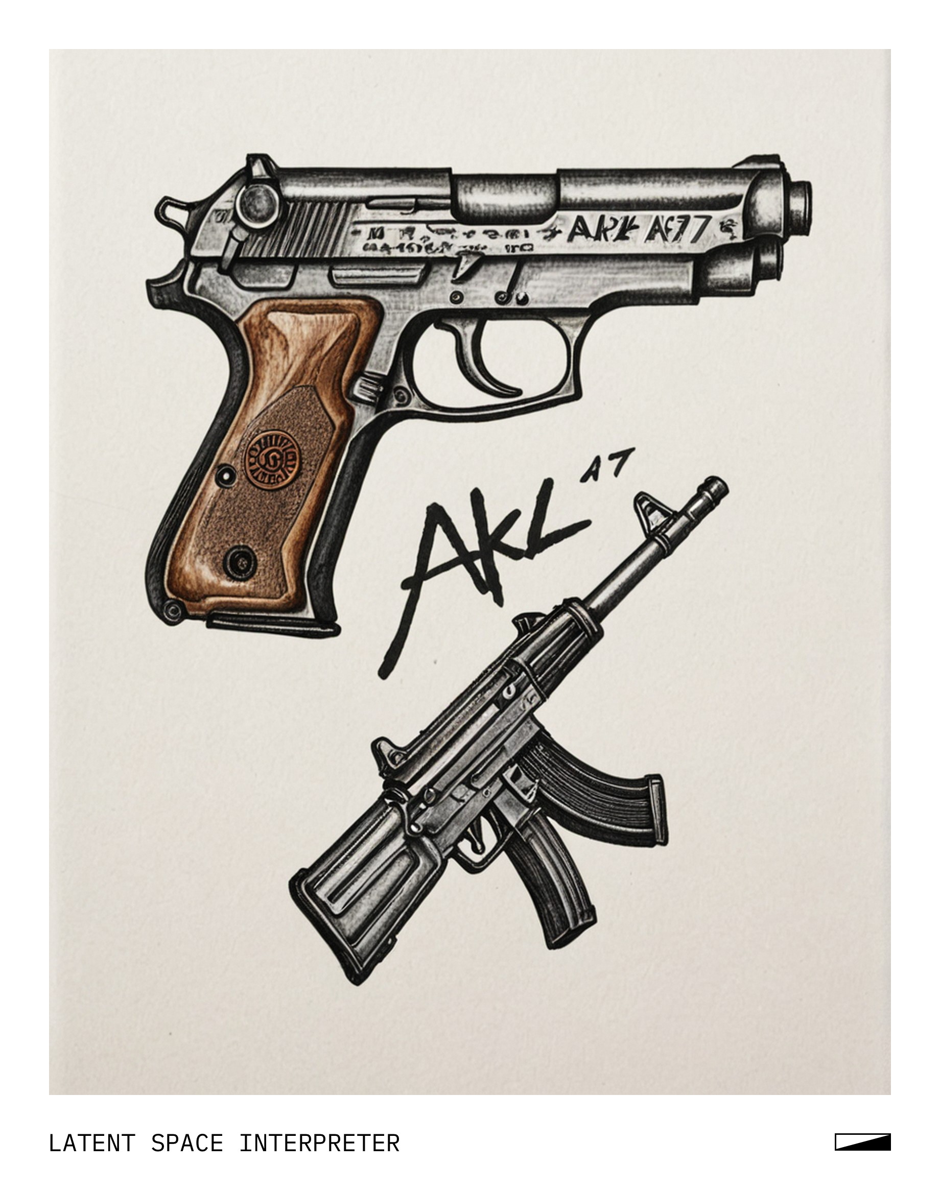 The image features a hand-drawn picture of a gun on a piece of paper, with the words "AK-47" written below it. The drawing is quite detailed and captures the essence of the weapon. The scene appears to be set against a white background, which emphasizes the artistic representation of the gun.