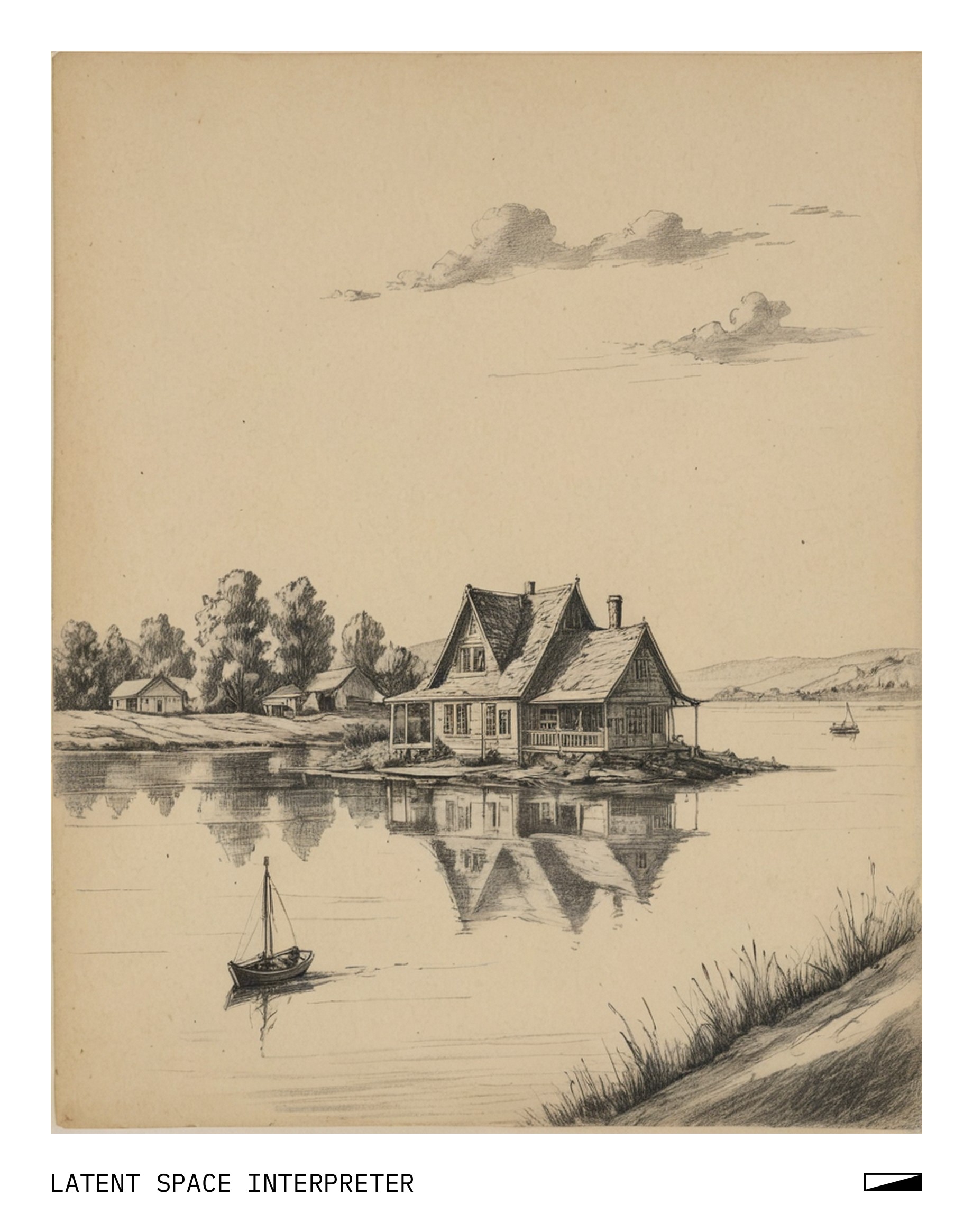 The image features a drawing of a house on a piece of paper, likely done by hand or with the help of a pencil. The house is depicted as having a triangular shape and appears to be situated near water. A boat can also be seen floating nearby, adding to the overall scene's atmosphere.