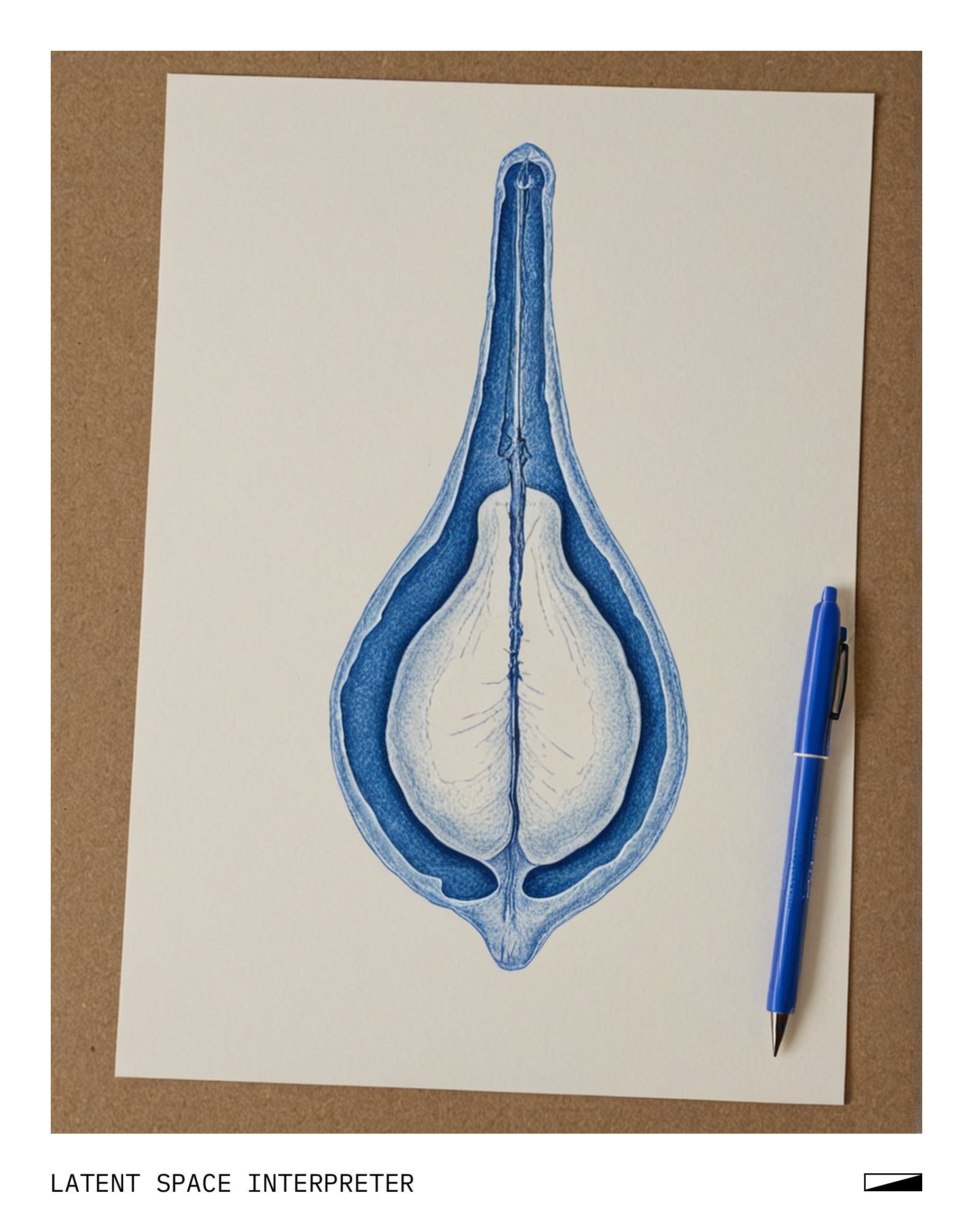 The image features a white piece of paper with a blue pen drawing of a man's genitalia, including the outline of a penis and testicles. The drawing is quite detailed, capturing the shape and contours of the male reproductive organs. The paper appears to be placed on a table or other flat surface, providing a clear view of the artwork.