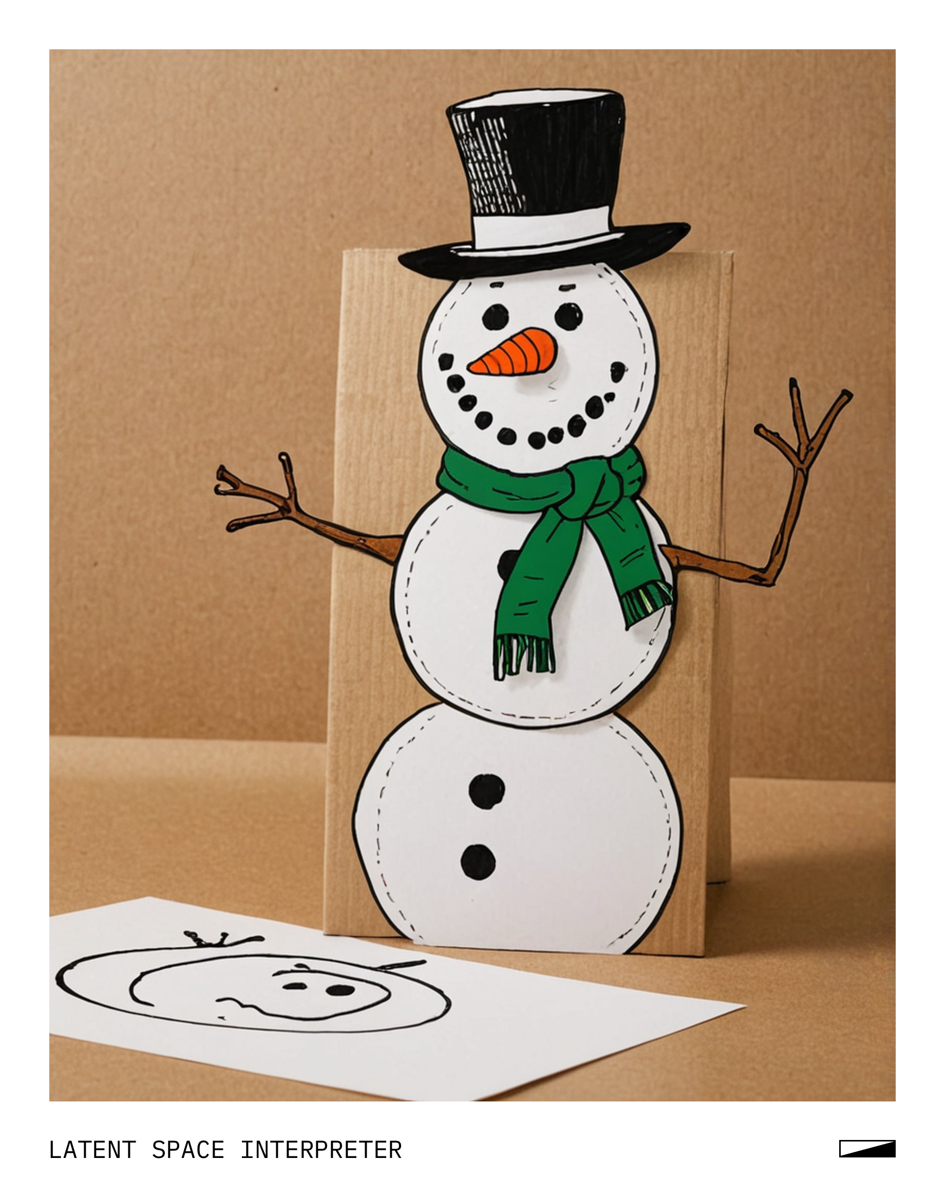The image features a drawing of a snowman on a piece of paper, which is placed on top of a cardboard box. The snowman has a big head and two small arms, giving it a unique appearance. The drawing appears to be hand-drawn, adding a personal touch to the scene.
