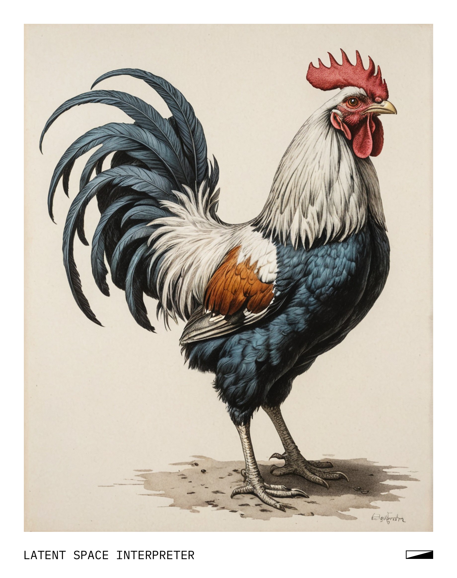 The image features a hand-drawn picture of a bird, possibly a rooster or a chicken, standing on the ground with its feet spread out. The drawing is quite detailed and captures the bird's unique features. The background appears to be white, providing a clean and uncluttered space for the artwork.