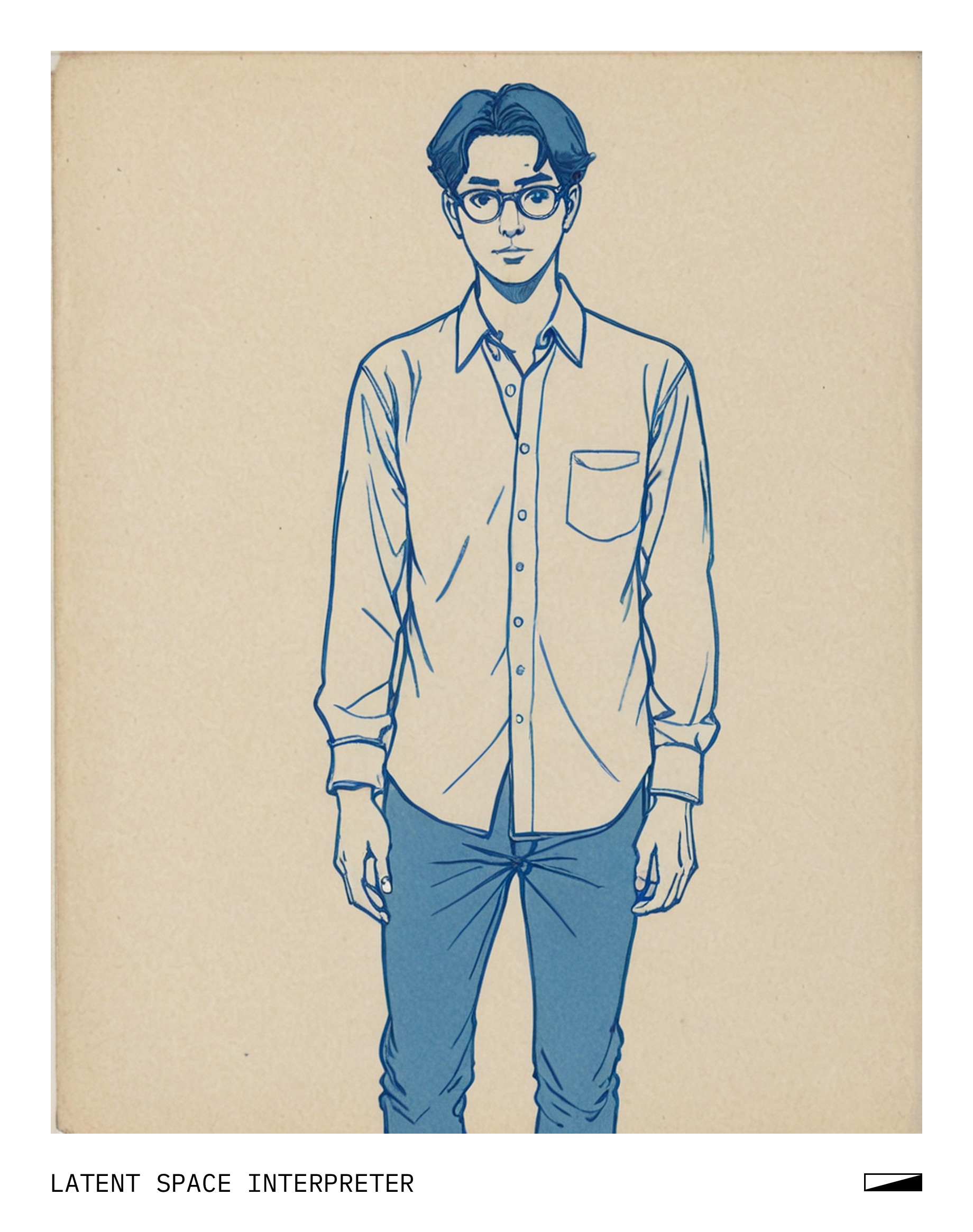 The image features a drawing of a person wearing a white shirt, standing on the left side of the picture. The figure is depicted with a blue outline, giving it a unique appearance. In addition to the main character, there are two smaller figures located towards the right side of the scene, possibly representing other people or objects.