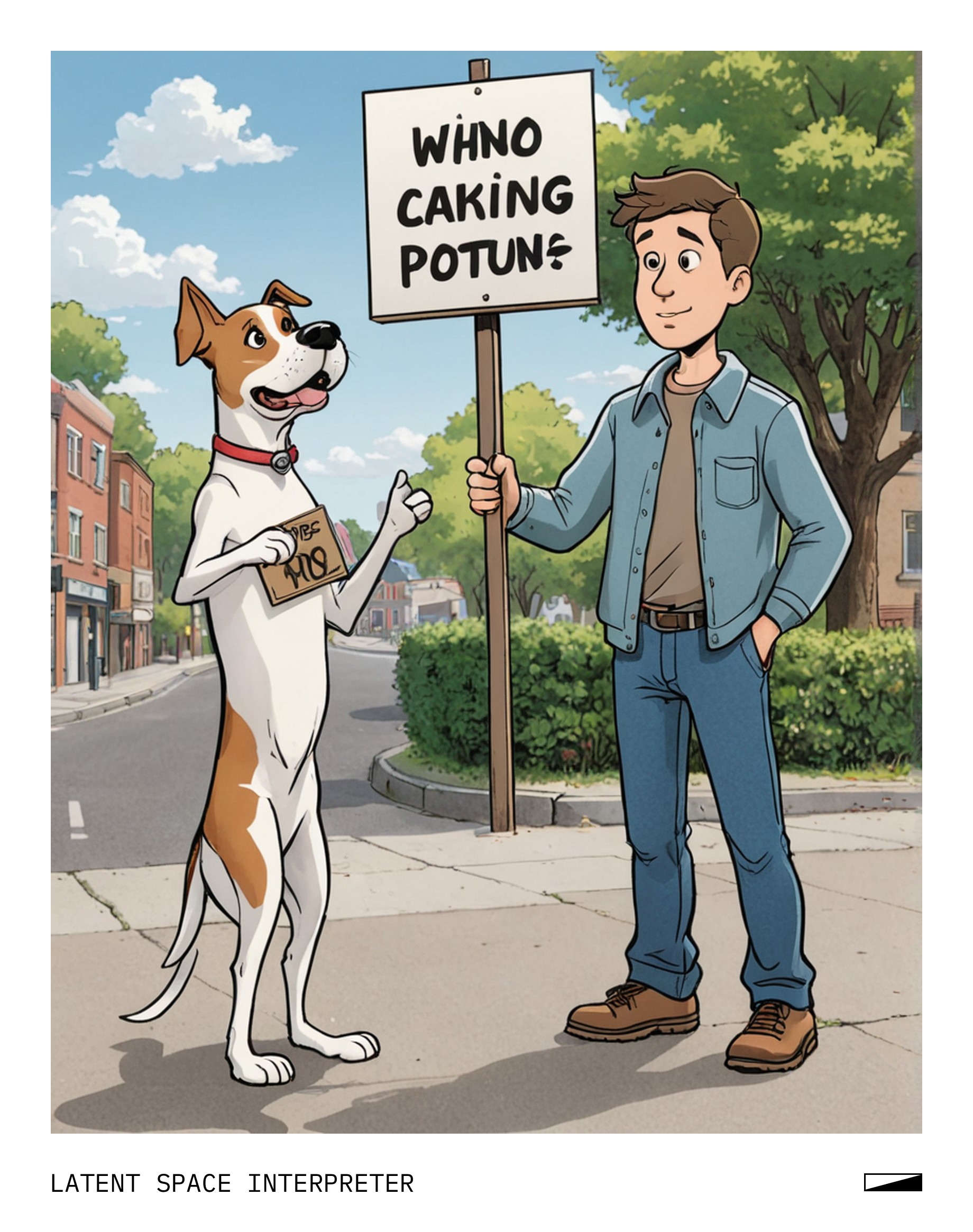 The image features a cartoon drawing of a person holding a sign, possibly advertising something or expressing their opinion. The person is standing next to a dog, which appears to be the main focus of the scene. The dog is positioned on the left side of the image and seems to be looking at the person with the sign.