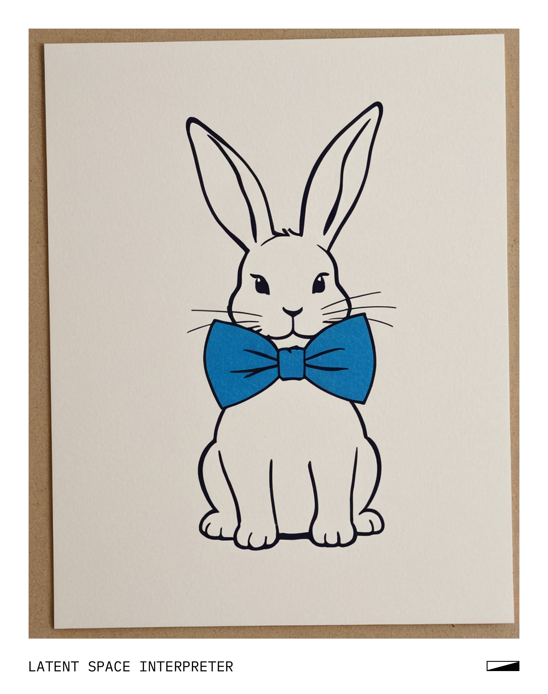 The image features a white piece of paper with a blue bunny drawn on it, giving the impression that the rabbit is wearing a bow tie. The drawing appears to be a simple and playful representation of a rabbit.