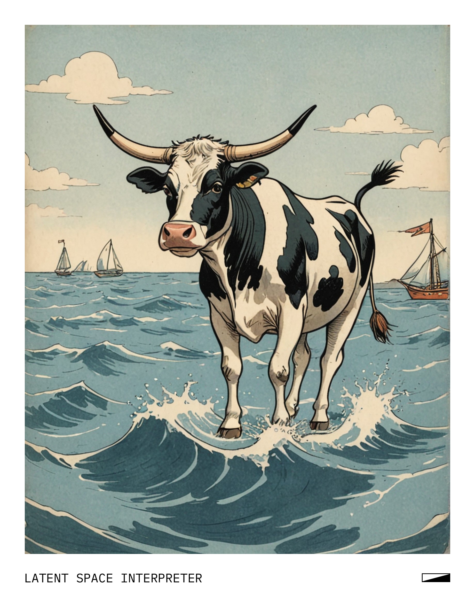 The image features a cartoon drawing of a cow, which is depicted as a small animal with horns and legs. It appears to be walking across the ocean or through a body of water, possibly on a boat. The cow's position suggests that it might be crossing the water or exploring its surroundings.
