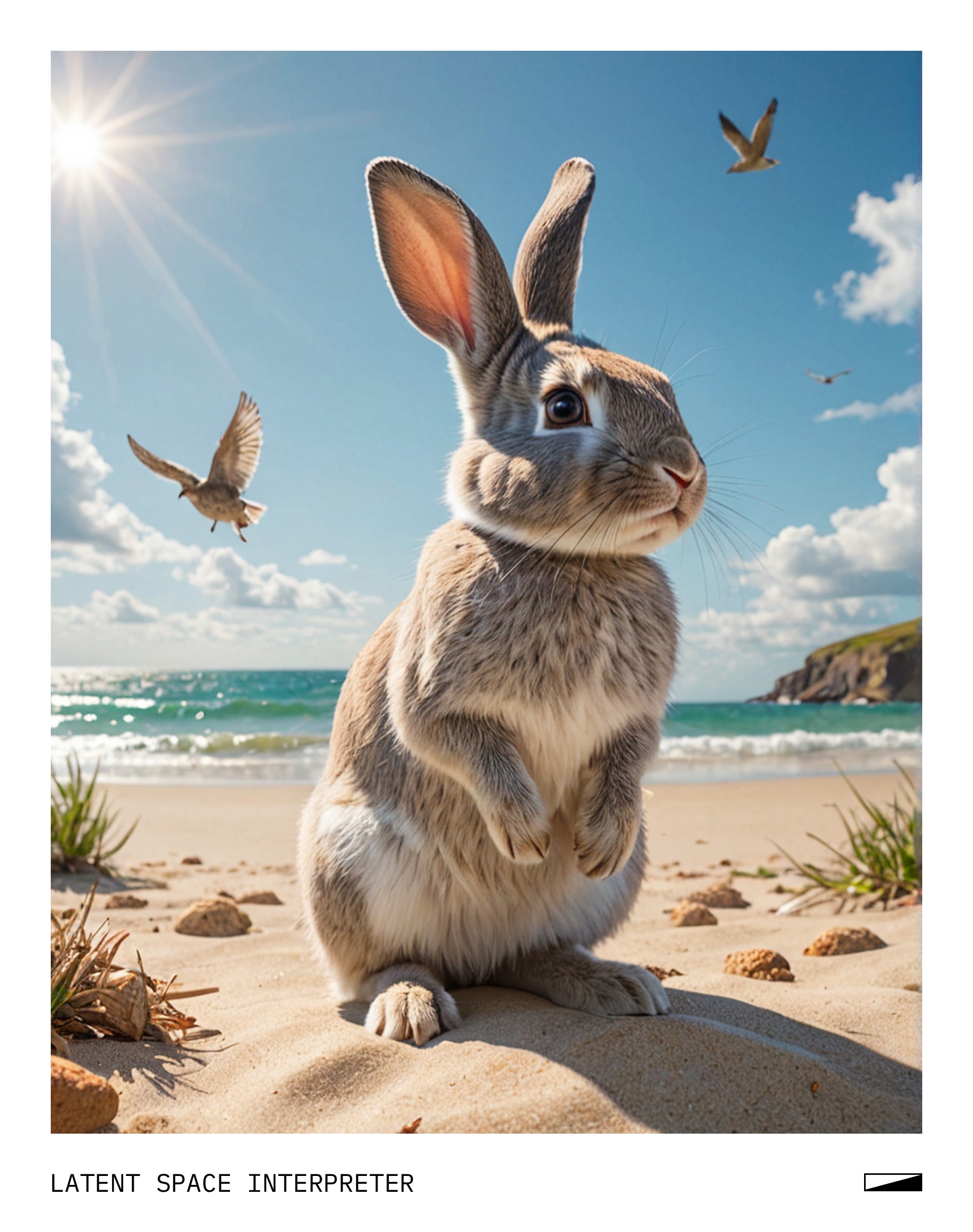 The image features a drawing of a cute little bunny rabbit standing on the beach, with a sunny sky above it. The rabbit is positioned near the center of the scene and appears to be enjoying its time at the seaside. In addition to the main rabbit, there are several birds scattered throughout the picture, adding a lively atmosphere to the scene. Some birds can be seen flying or perched around the area, while others are closer to the ground.