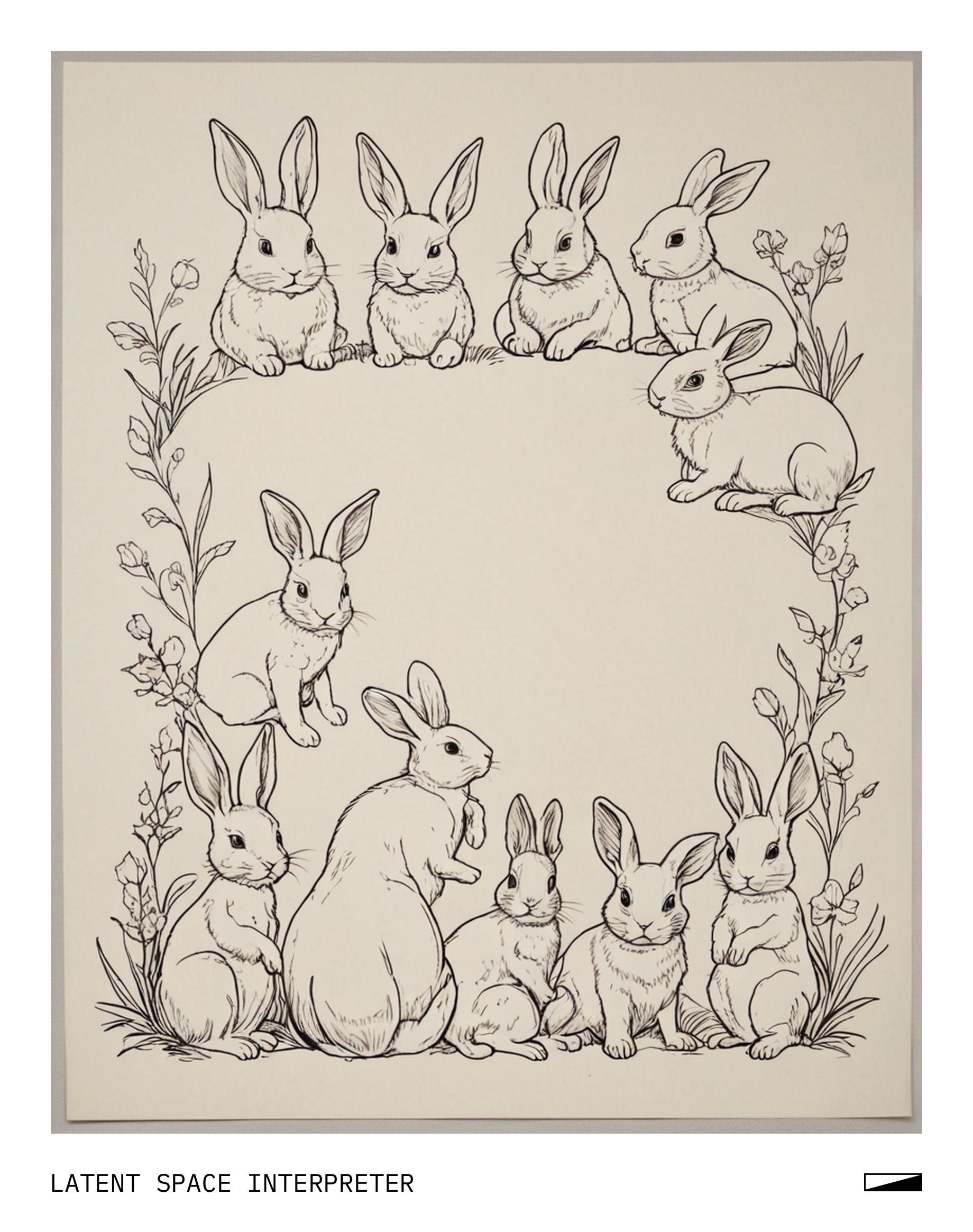 The image features a white sheet of paper with various bunny drawings on it, including a large bunny and smaller ones surrounding it. There are six bunnies in total, each varying in size and positioned around the central bunny. Some of these bunnies are located closer to the edges of the paper while others are more centrally placed. The drawing style appears to be simple and childlike, making it suitable for a young audience or as a fun art project.