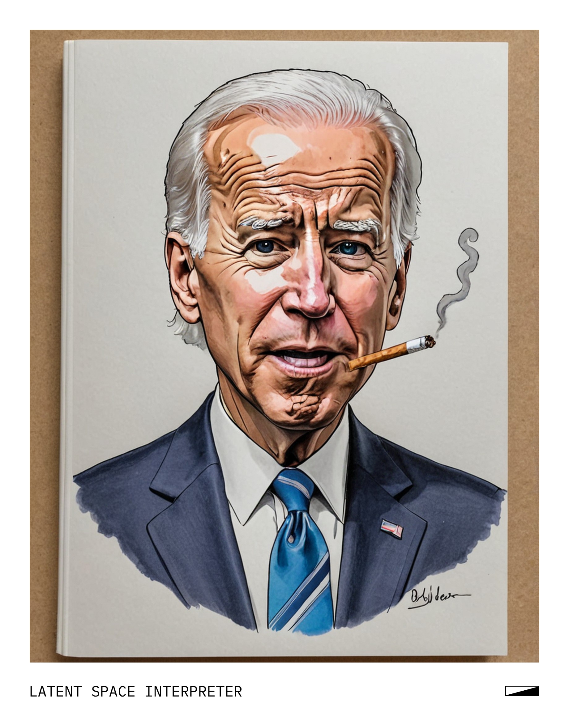 The image features a cartoon drawing of Joe Biden, the former Vice President of the United States, with a cigarette in his mouth. The cartoon is drawn on a piece of paper or cardboard, which has been placed on top of a book. The drawing captures the essence of Joe Biden's persona and adds humor to the scene.