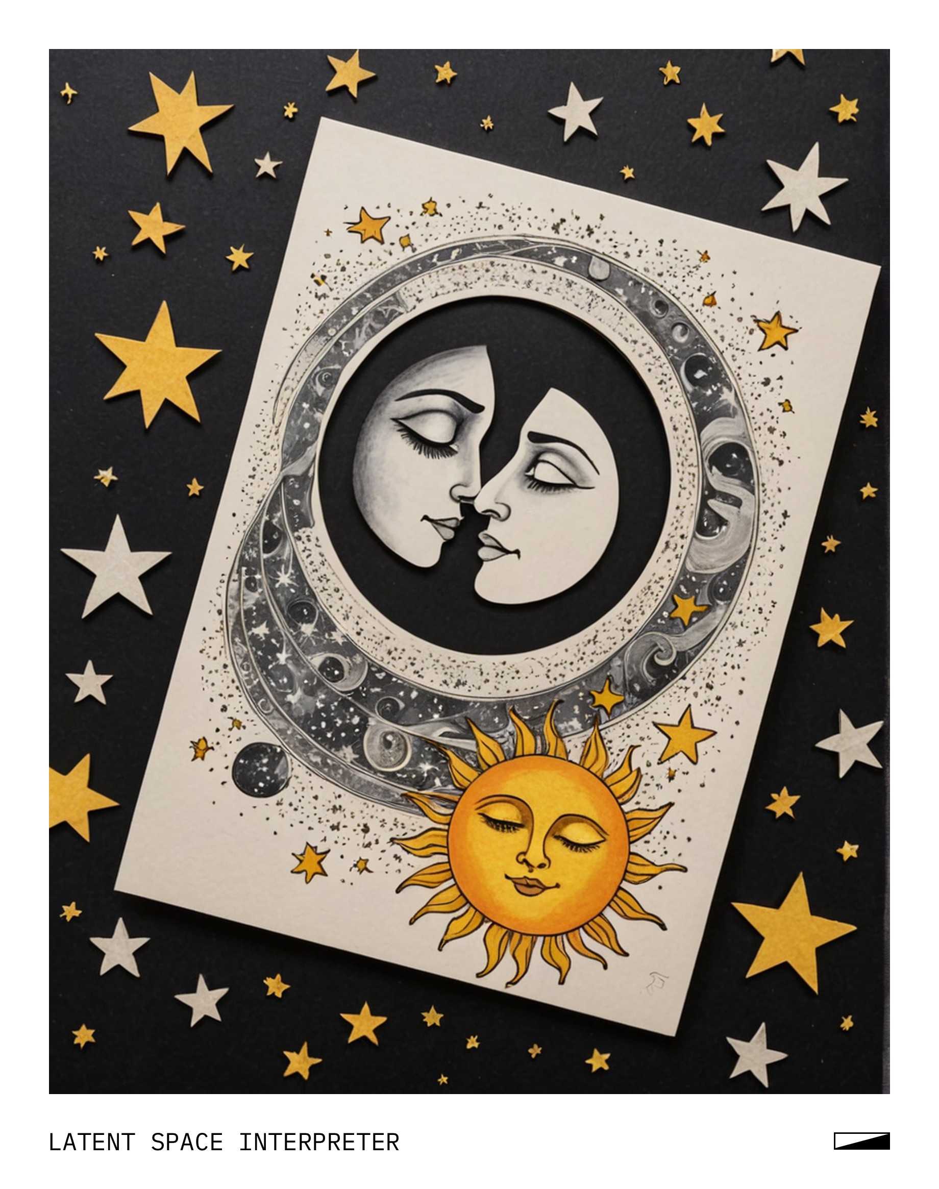 The image features a drawing of the moon and sun kissing, with the moon positioned above the sun. This artistic representation is placed on top of a piece of paper or cardboard. The scene appears to be set against a backdrop of stars, adding to the celestial theme of the drawing.