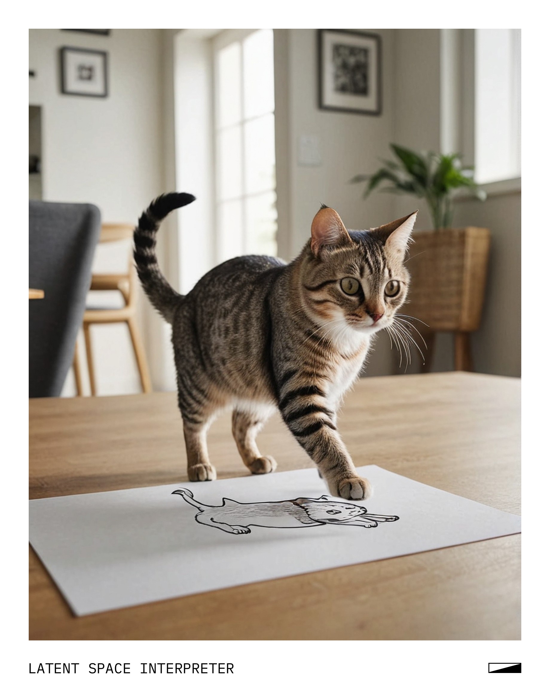 The image features a cat drawing on a piece of paper, which is placed on a table or countertop. The cat appears to be walking across the paper, with its body and legs visible as it moves. The drawing captures the essence of the cat's movement, making it seem like a real-life scene.