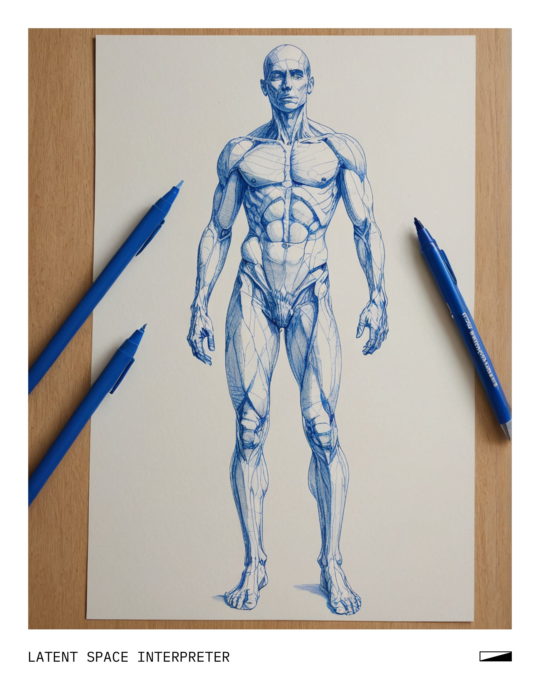 The image features a white piece of paper with a blue pen drawing of a person's body, specifically the torso and legs. The drawing is quite detailed, capturing the shape and contours of the human form. The paper appears to be placed on a table or other flat surface, providing a clear view of the artwork.