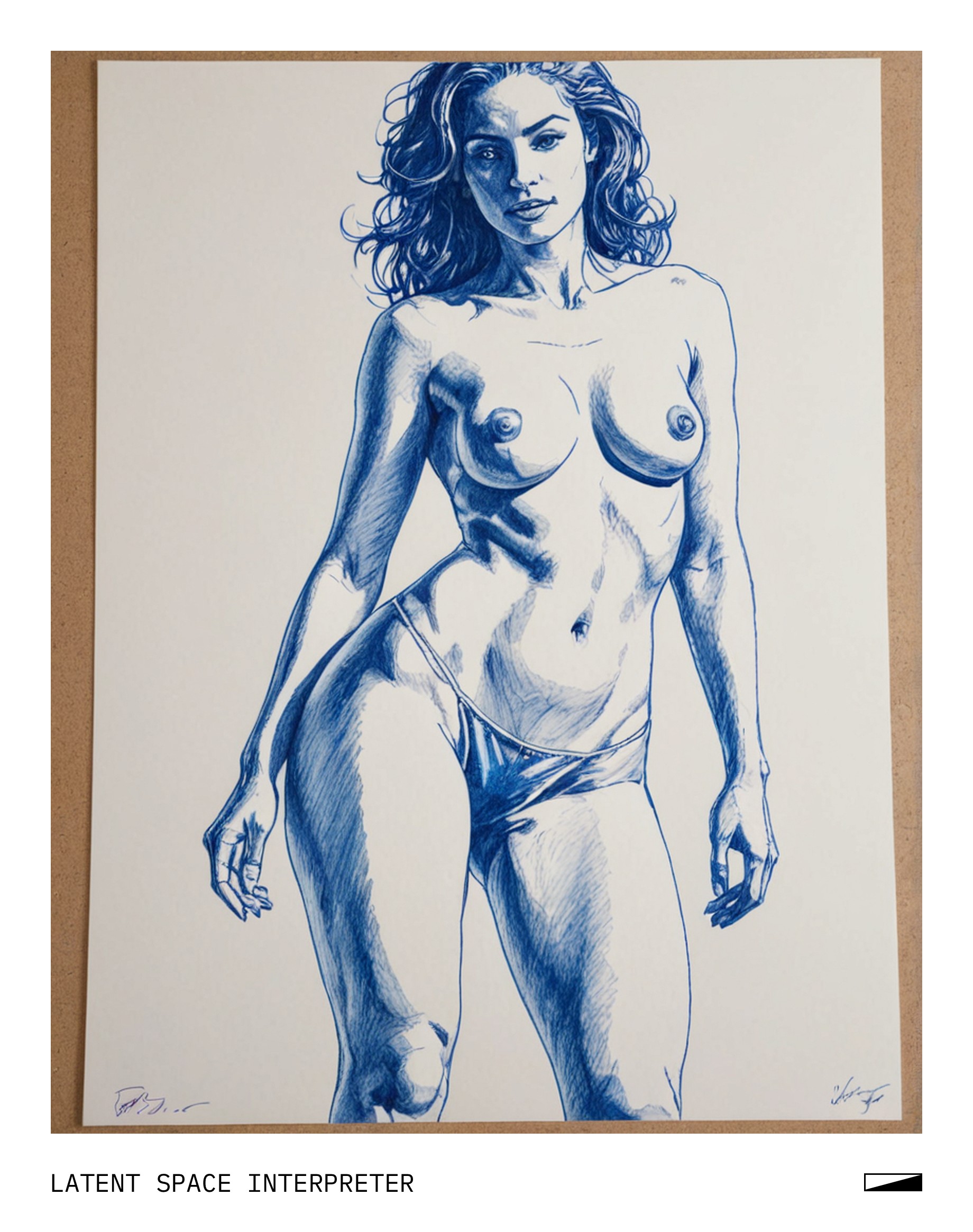 The image features a white piece of paper with a blue pen drawing of a woman's body, including her torso and legs. The drawing is quite detailed, capturing the curves and contours of the female form. The paper appears to be placed on a table or other flat surface, providing a clear view of the artwork.