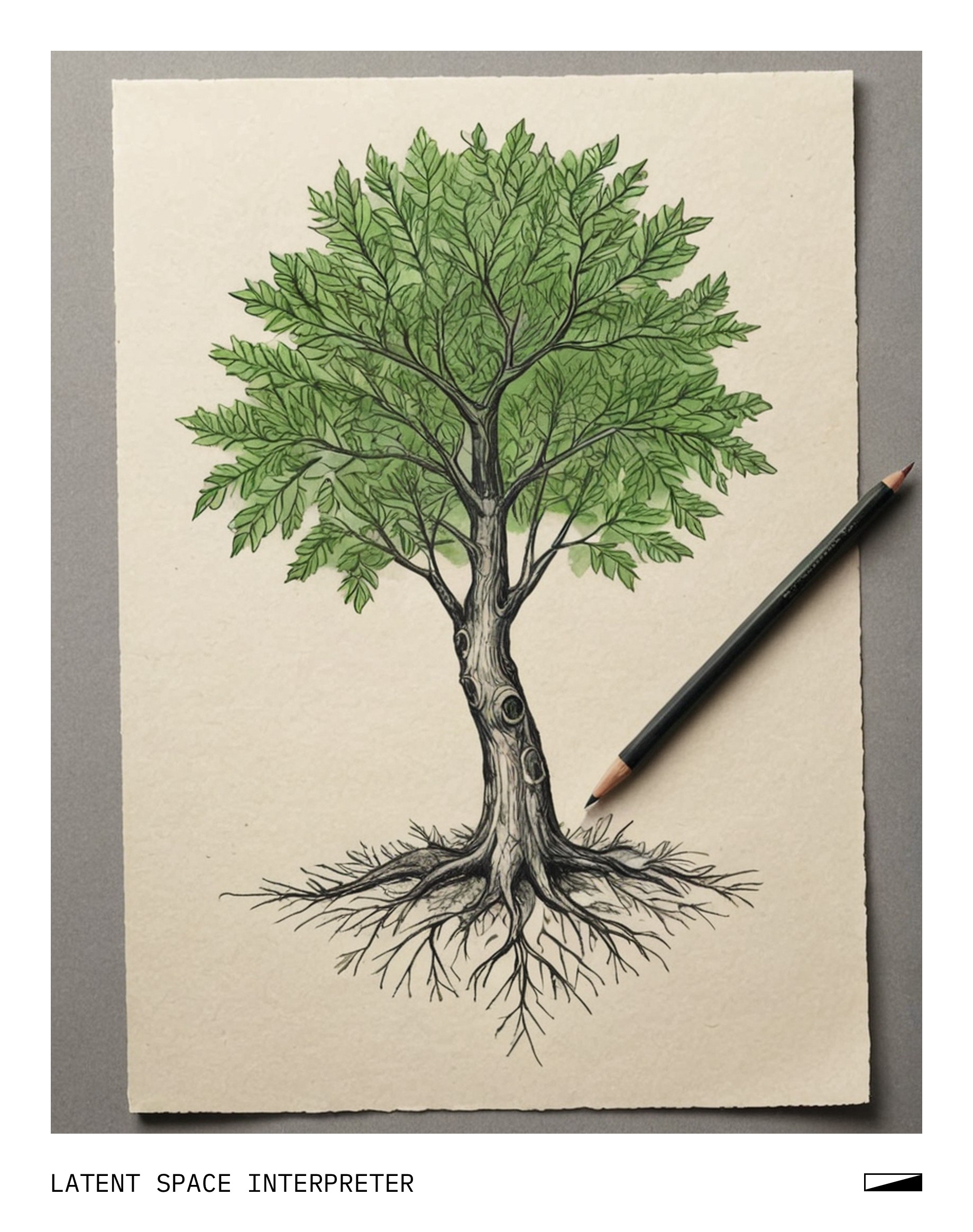 The image features a hand-drawn picture of a tree on a piece of paper, which is placed on top of another piece of paper. The drawing captures the essence of the tree with its branches and leaves, creating a visually appealing representation of nature. The artwork appears to be done by someone using a pencil or similar tool, as it has a somewhat sketchy appearance.