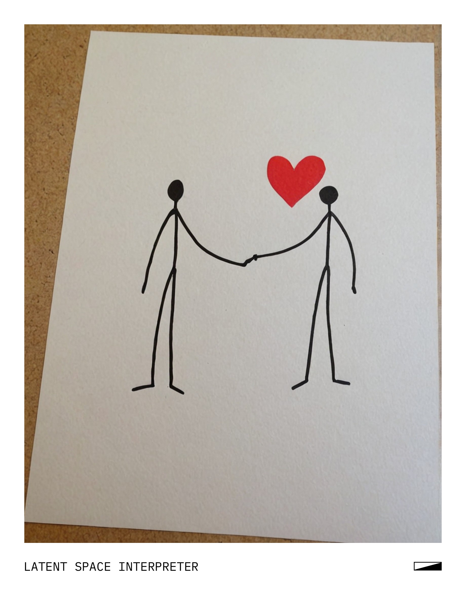 The image features a white piece of paper with two stick figures drawn on it, each holding a heart. One figure is positioned towards the left side of the paper, while the other is located more towards the right. These stick figures appear to be standing next to each other, possibly representing a couple or friends sharing their love for one another.