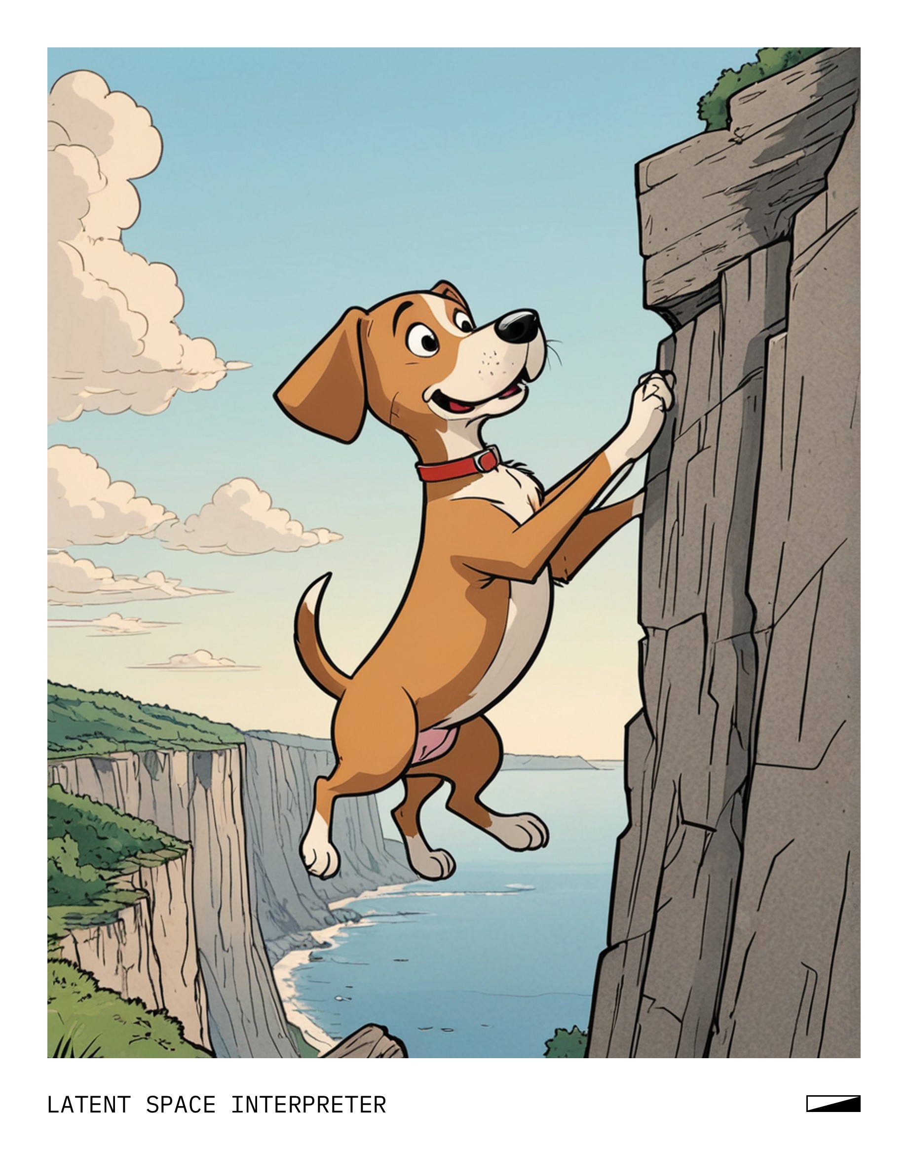 The image features a cartoon drawing of a dog with its head hanging over the edge of a cliff, seemingly about to fall off. The dog's body is positioned on the left side of the image, while its head extends towards the right side. The drawing appears to be hand-drawn and has a unique style that adds character to the scene.