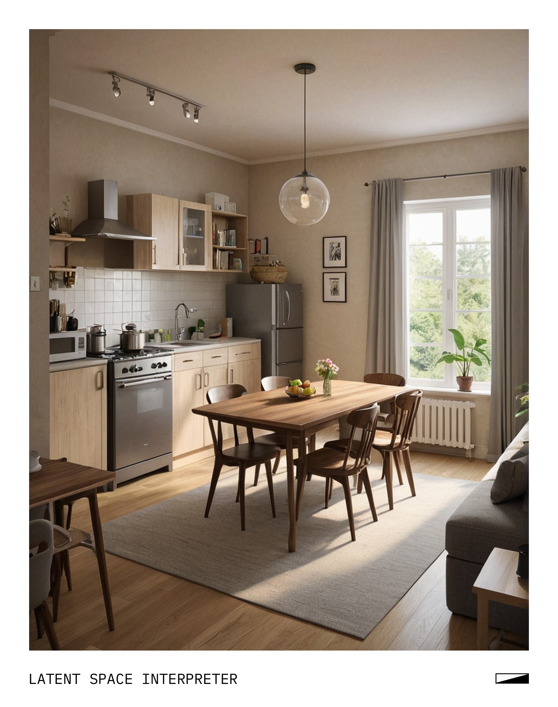 The image features a drawing of a room with various furniture items, including a chair and a dining table. There is also a couch situated within the space. Above the dining table, there is a clock hanging on the wall. Additionally, a bowl can be seen placed near the edge of the scene. The overall setting appears to be a cozy living area or a small studio apartment.