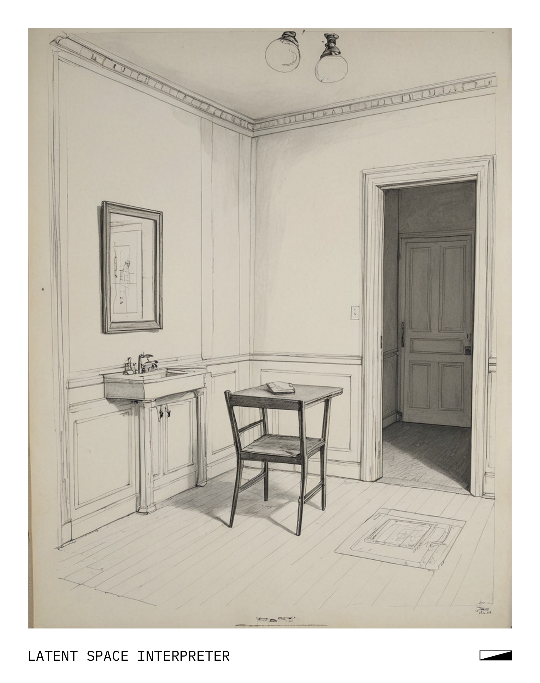 The image features a room with a white wall and a doorway. Above the doorway, there is a drawing of a chair, which appears to be a blueprint or sketch of the furniture. In addition to the chair, there are other drawings on the wall, including one depicting a sink and another showing a dining table. These drawings give the impression that the room might be under construction or being designed for a specific purpose.