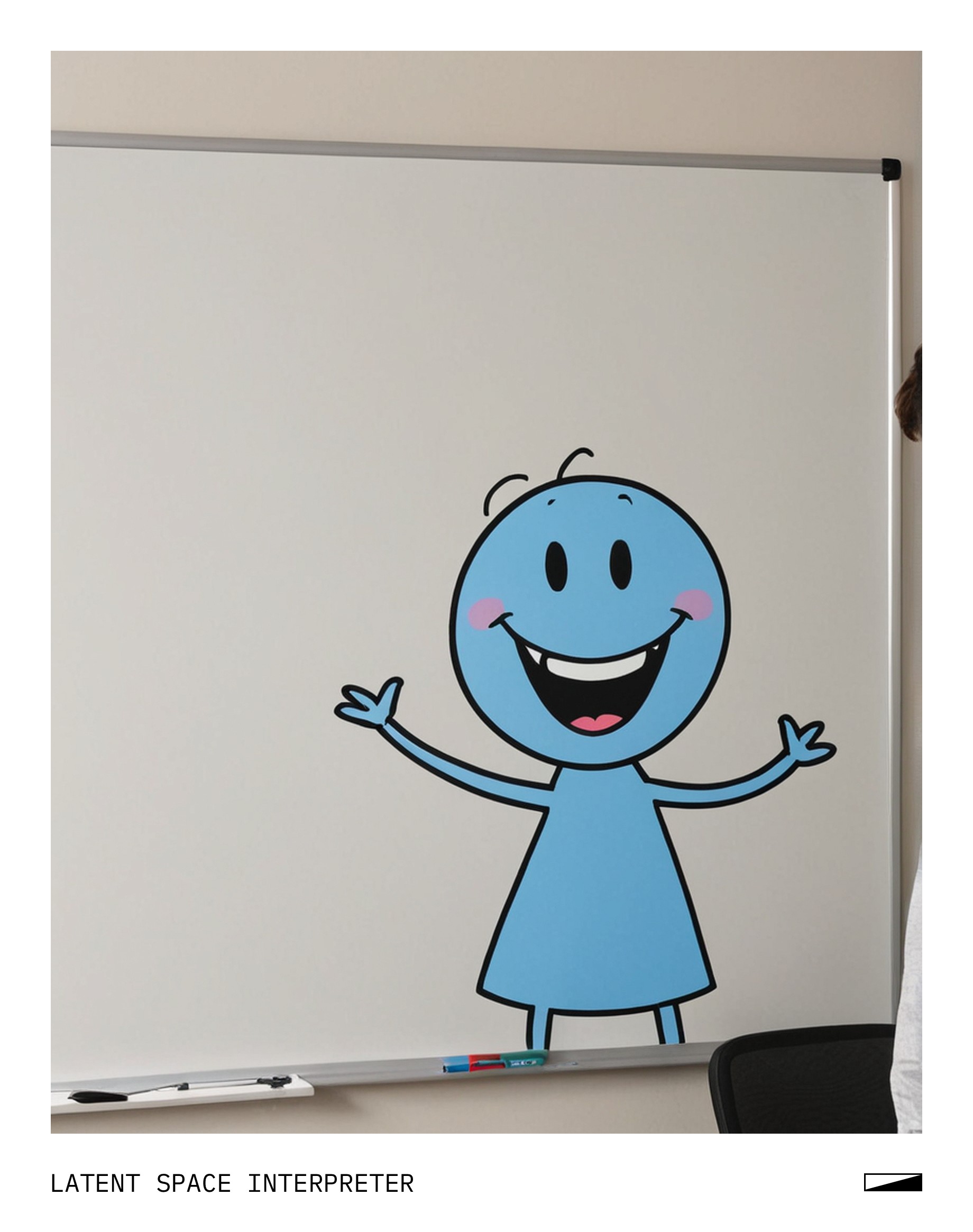 The image features a whiteboard with a blue cartoon drawing of a smiling person standing on it. The figure is positioned towards the left side of the board, and its facial expression appears to be happy or content. The overall scene gives off a lighthearted and cheerful vibe.